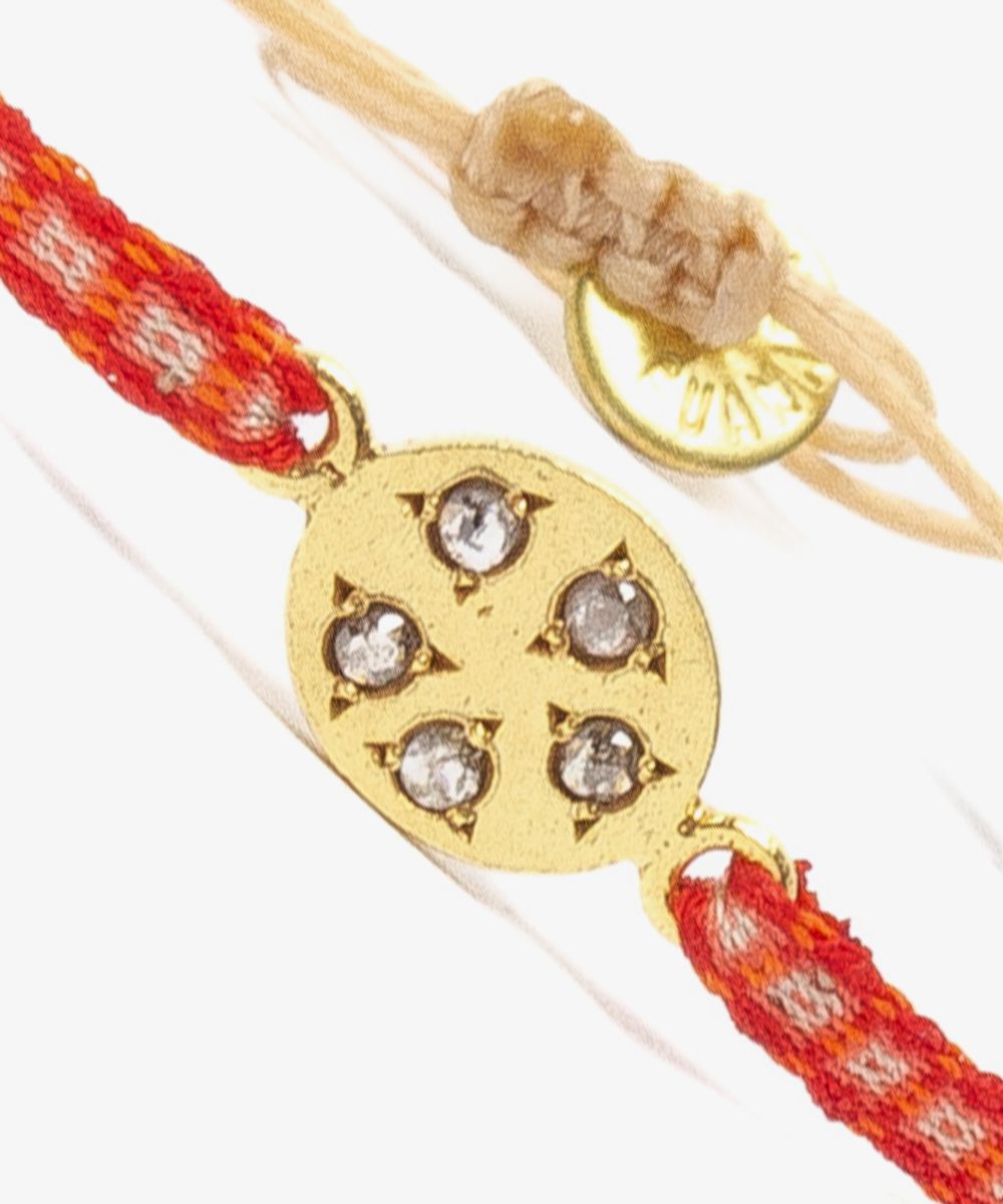 Materials: • Thread: 100% acrylic • Gold-plated silver ornament • 5 cut diamonds • Brass medallion Dimensions: • Width: 3 mm (0.7 inches) • Opening (min-max): 15 cm (5.9 inches) - 26 cm (10.23 inches)