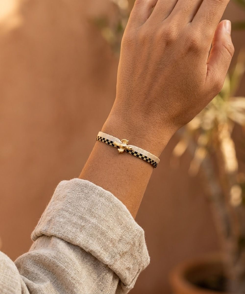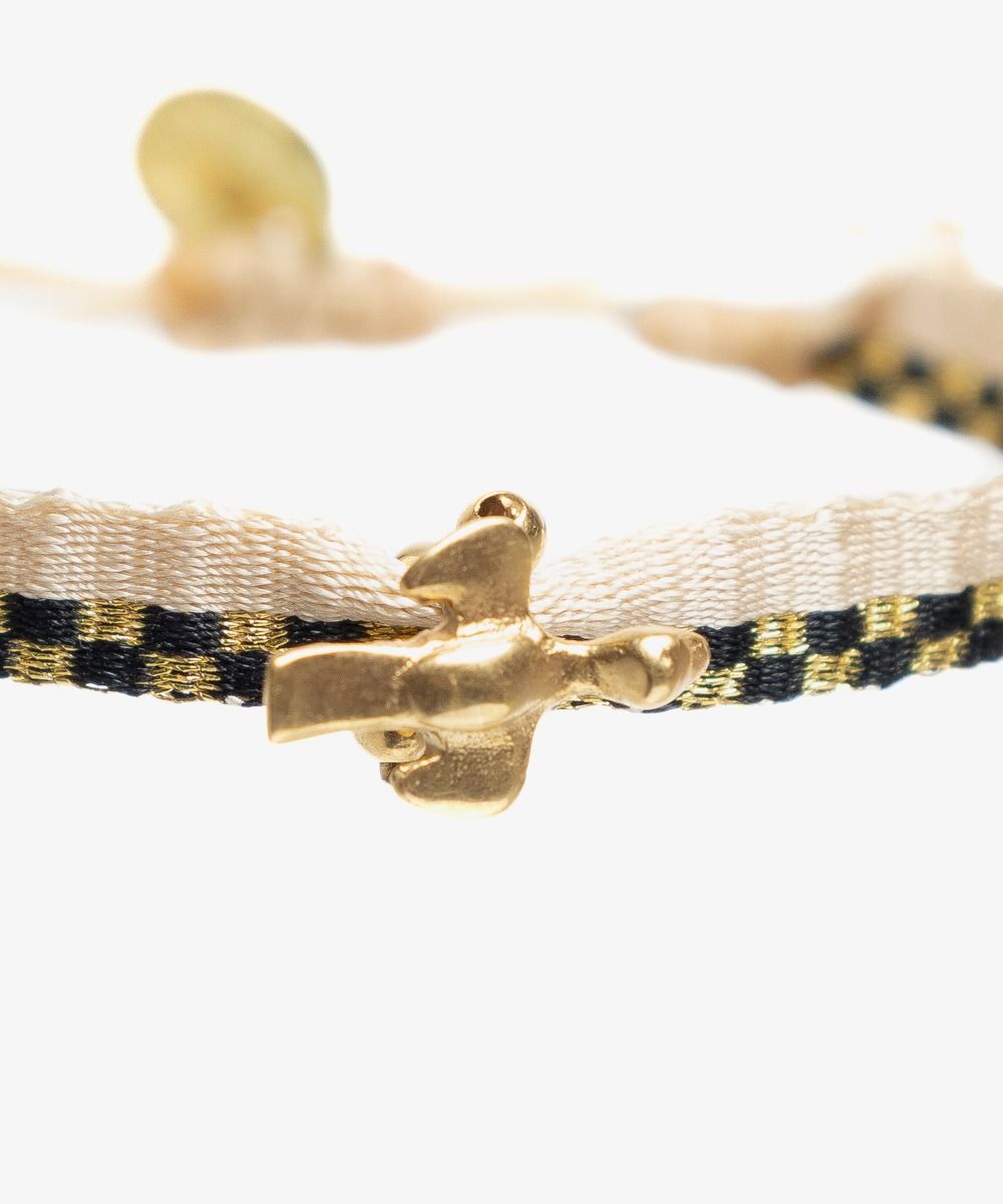This product is composed by bracelet + charm in 925 silver and plated in 24 karat gold. To preserve its brightness, we recommend you to avoid wearing it during activities such as: - Sport, water activities (swimming pool, sea...) or manual activities (gardening, cleaning, DIY...). - Wear it in the shower or bath. We recommend you to avoid exposing your jewelry to: - Corrosive products or chemicals present in cleaning products or cosmetics (cleaners, perfumes, creams...). To avoid damaging your charm, it is essential not to try to adjust it or modify its shape. The patina may fade over time, it is a normal result of natural wear and will depend on the care you give to your piece. You can clean your charm by rubbing it with a soft cloth.