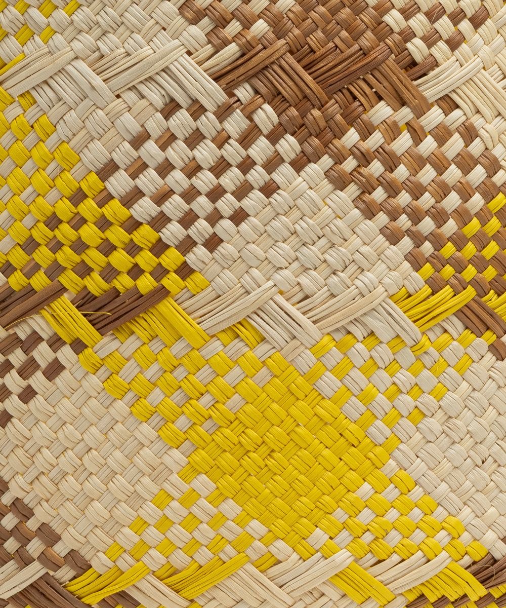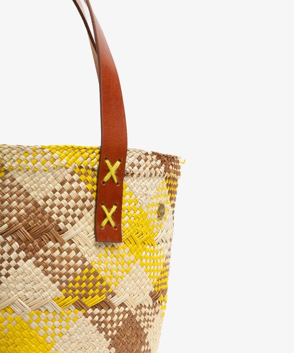 Materials: • 100% iraca straw • Brass medallion Dimensions: • Height: 19 cm • Handles length: 18cm • Opening diameter: 23 cm Each bag is unique and entirely handmade, so there may be slight variations in shape or size. Not machine washable, wash with a damp cloth.