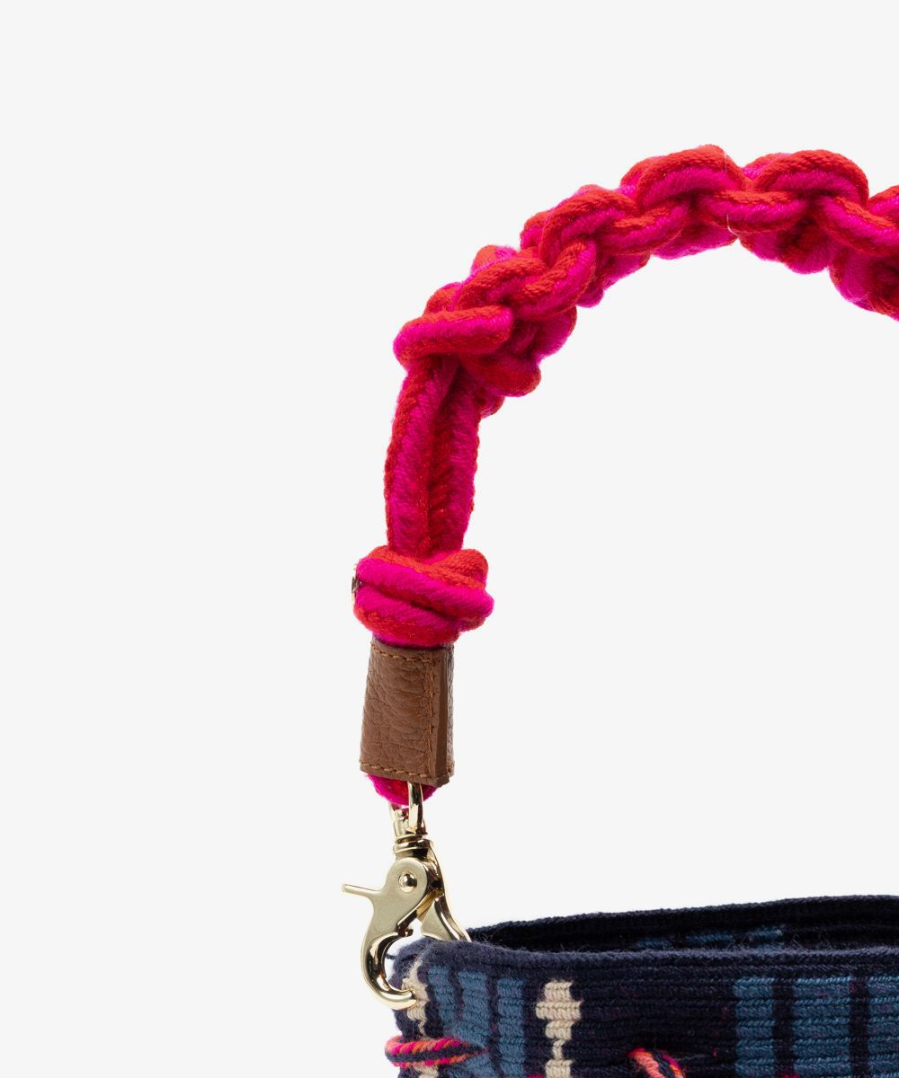 The bag is made from high-quality materials and features an intricate macramé pattern on its short handle. Macramé, an ancient decorative knotting technique, adds a bohemian and artistic touch to the design. Each knot has been meticulously created, reflecting the skill and passion of the artisan who crafted it.