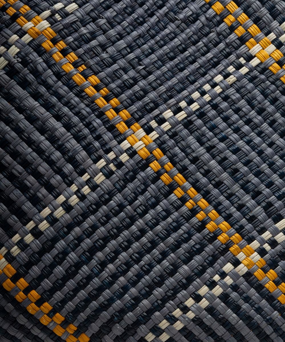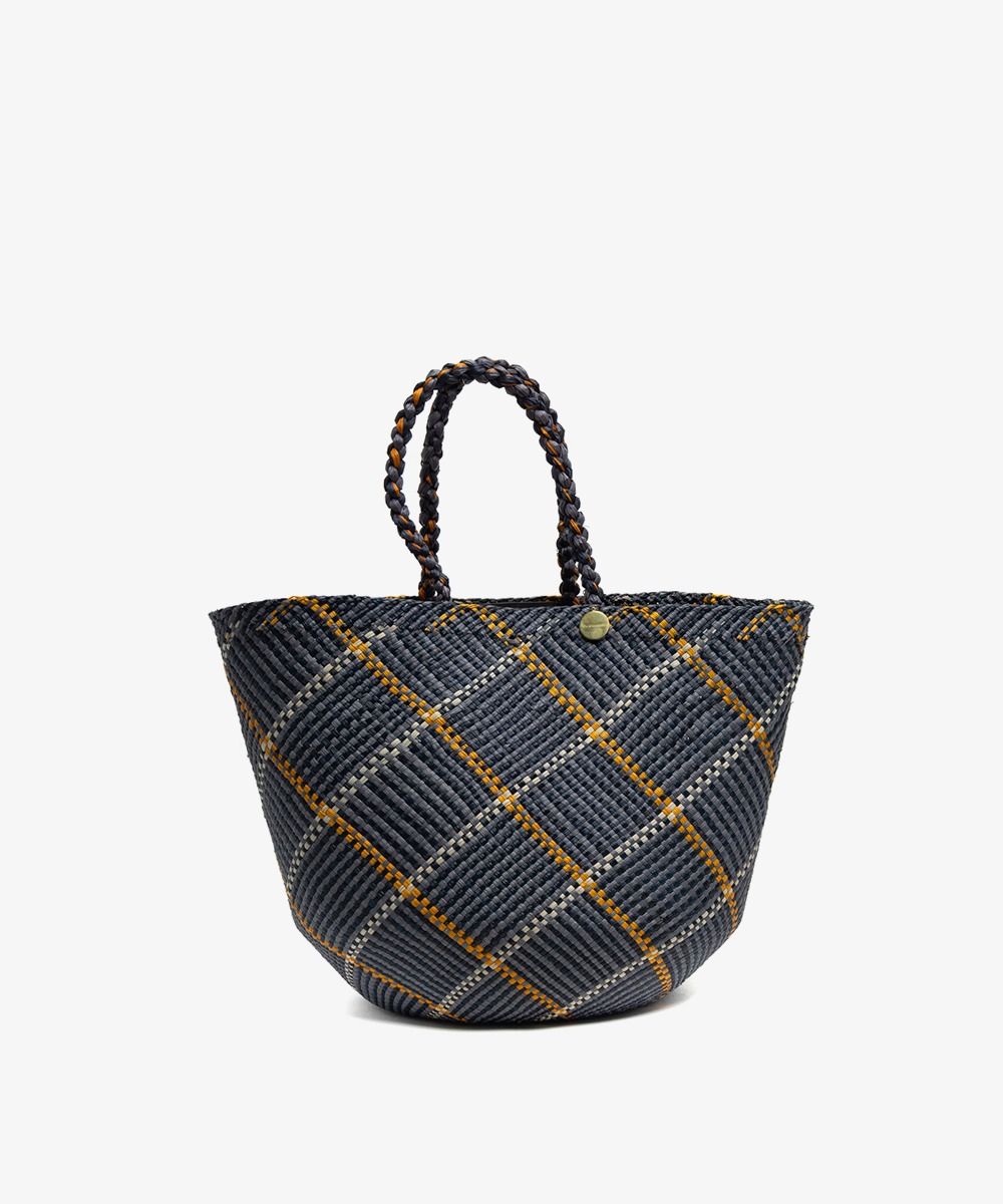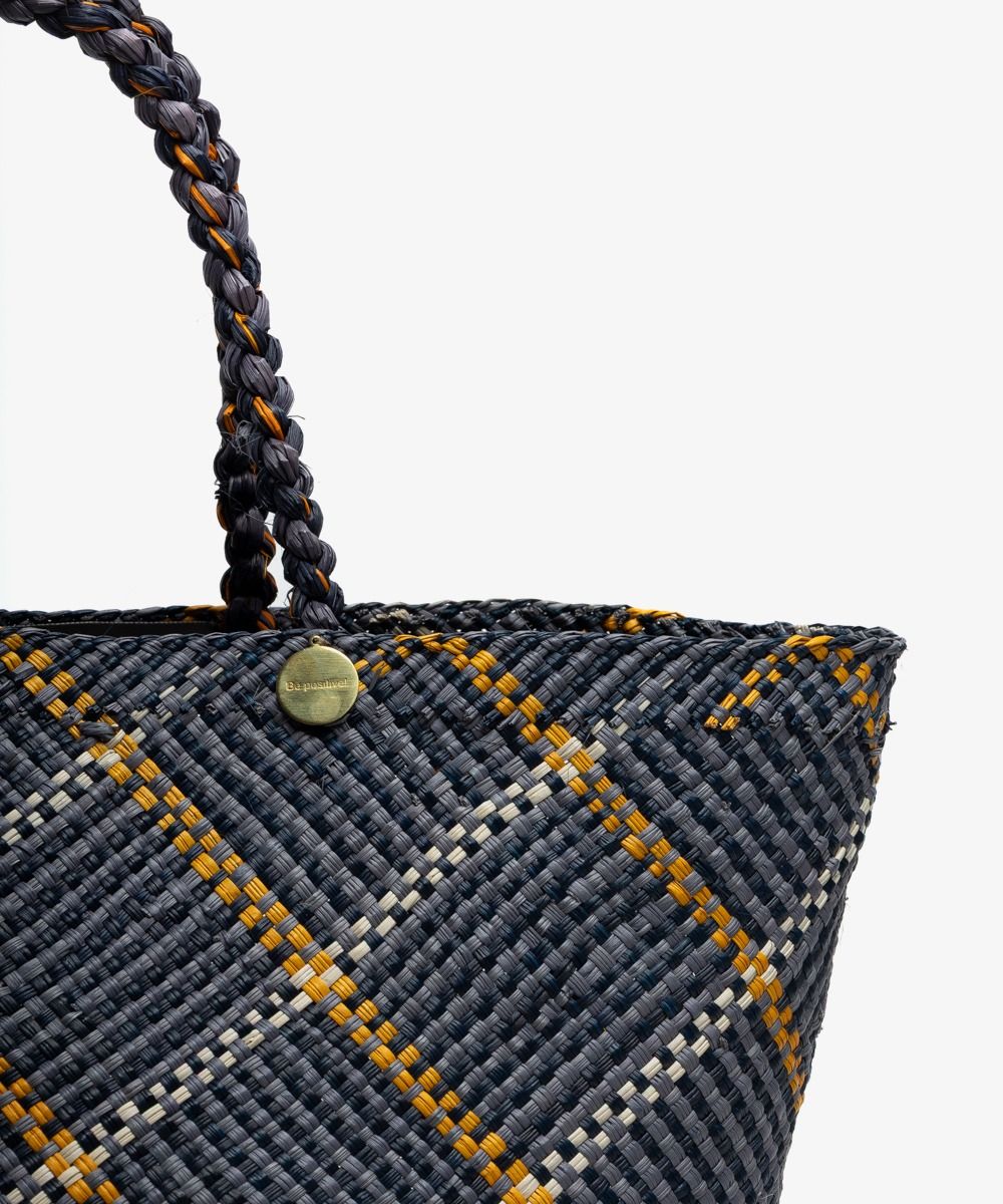 Materials: • 100% iraca straw • Brass medallion Dimensions: • Height: 23 cm • Handles length: 16 cm • Opening diameter: 32cm Each bag is unique and entirely handmade, so there may be slight variations in shape or size. Not machine washable, wipe with a damp cloth.