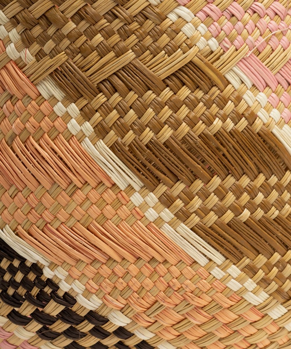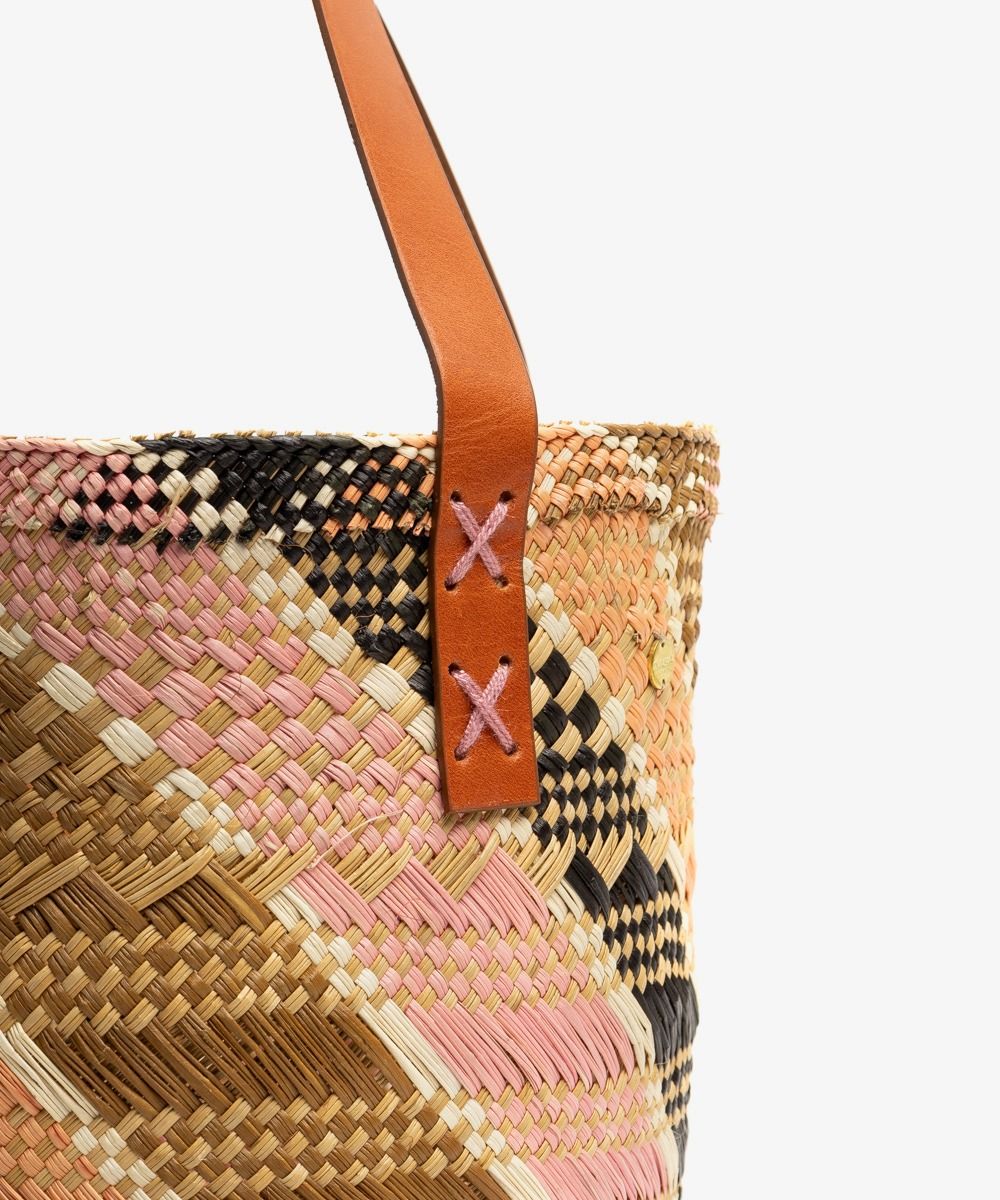 Materials: • 100% iraca straw • Brass medallion Dimensions: • Height: 19 cm • Handles length: 18cm • Opening diameter: 23 cm Each bag is unique and entirely handmade, so there may be slight variations in shape or size. Not machine washable, wash with a damp cloth.
