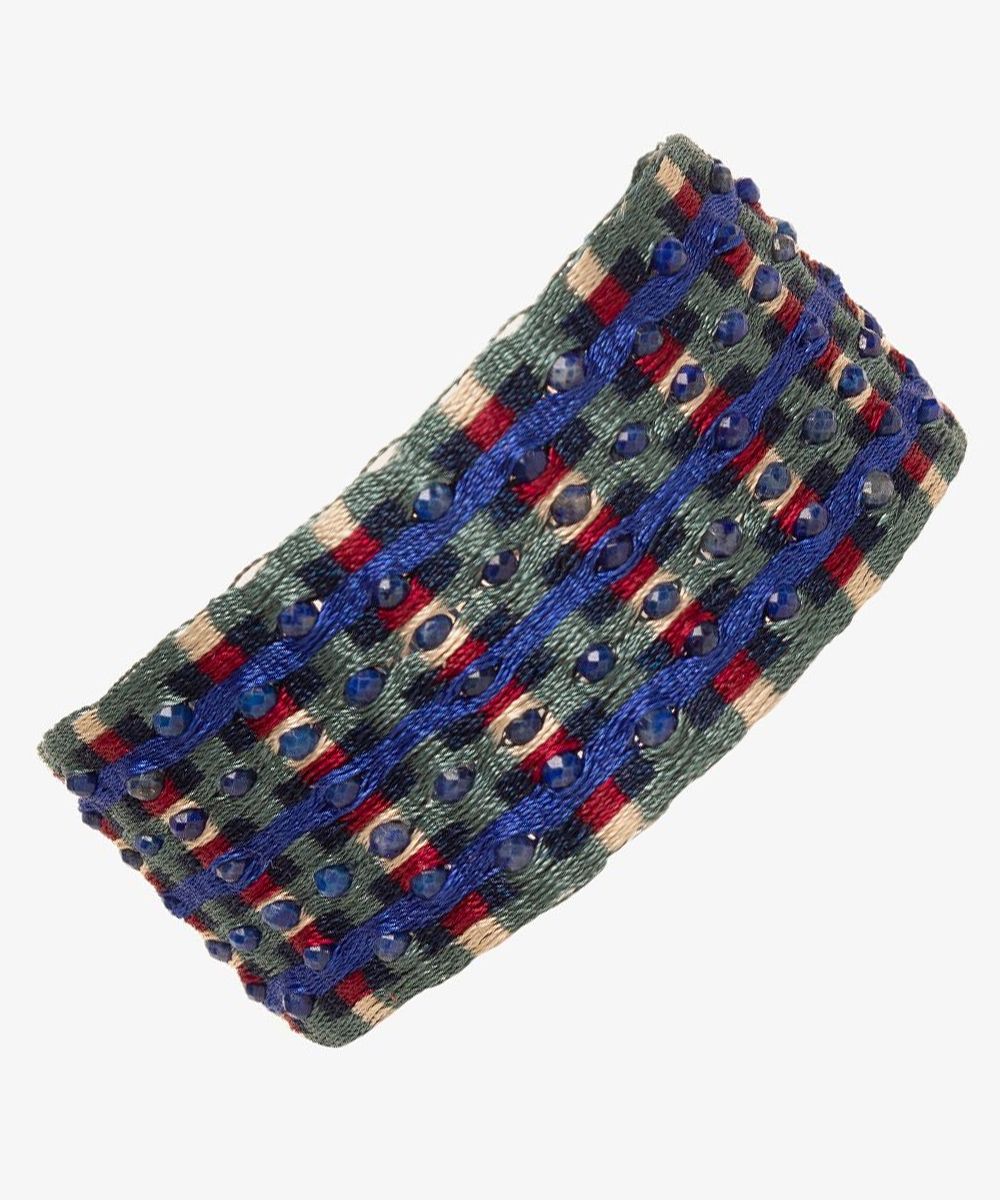 Materials: • 100% acrylic • Semi-precious stone beads • Brass medallion Dimensions: • Width: 2 cm (0.7 inch) • Opening (min-max): 15 cm (5.9 inches) - 26 cm (10.23 inches) • Diameter of beads: aprox. 2mm