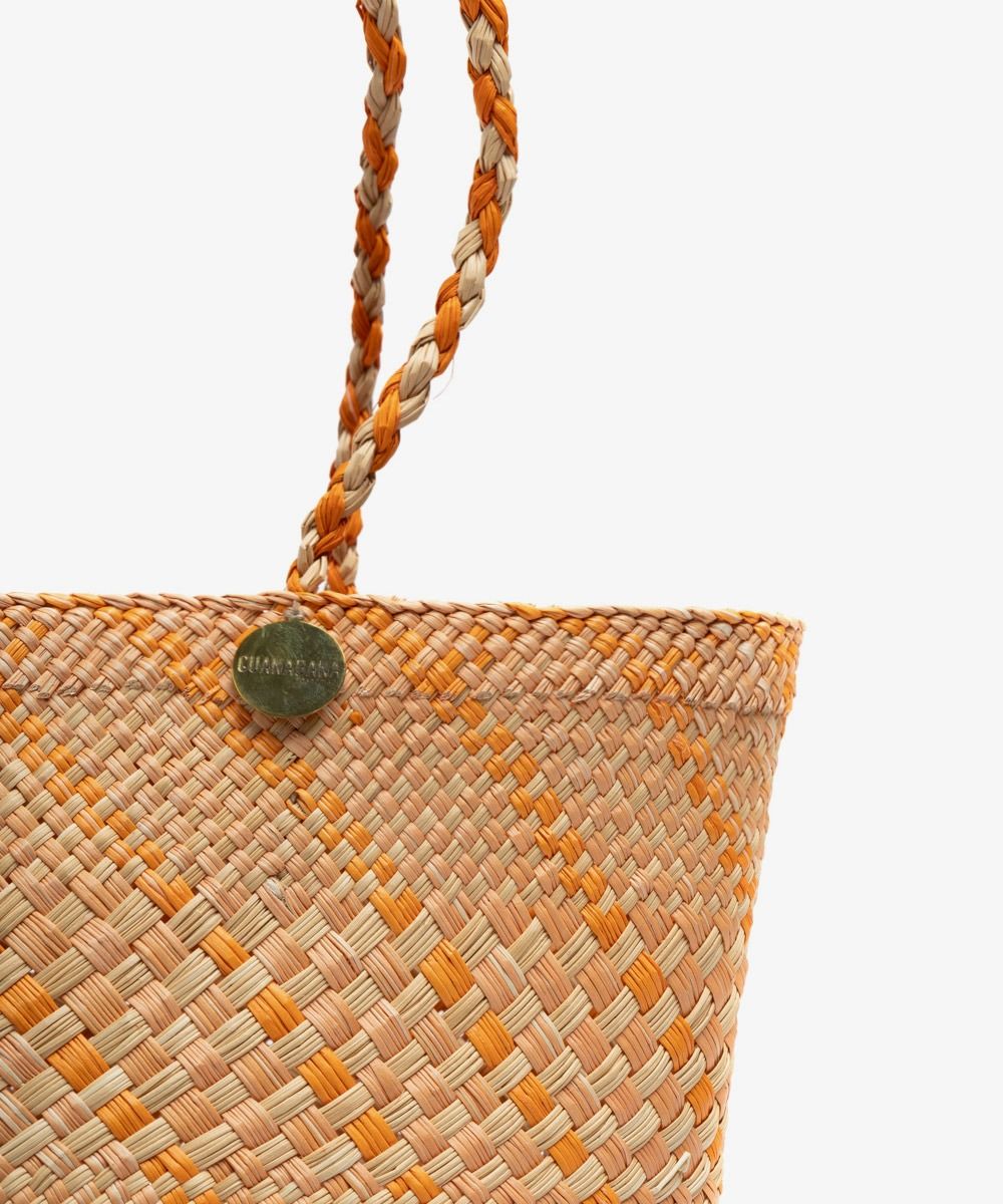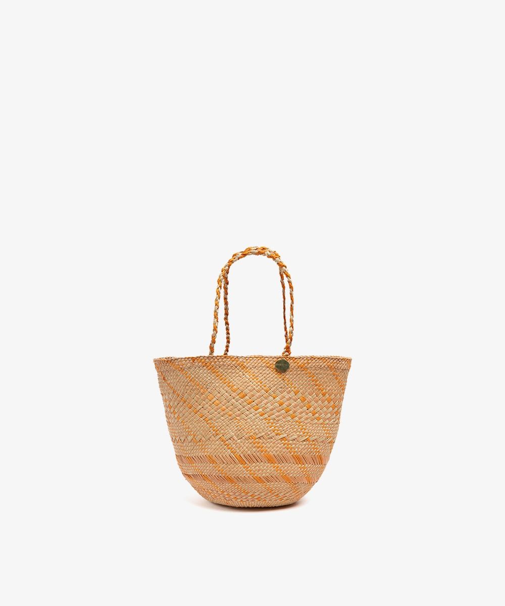 Materials: • 100% iraca straw • Brass medallion Dimensions: • Height: 17 cm (5.9 inches) • Handles length: 16 cm (6.2 inches) • Opening diameter: 22 cm (8.6 inches) Each bag is unique and entirely handmade, so there may be slight variations in shape or size. Ma-chine washable in cold water. Not machine washable, wash with a damp cloth.