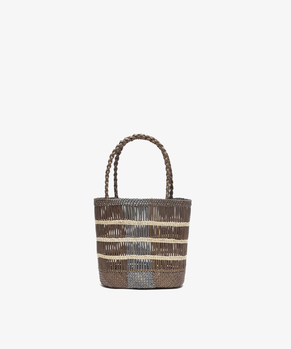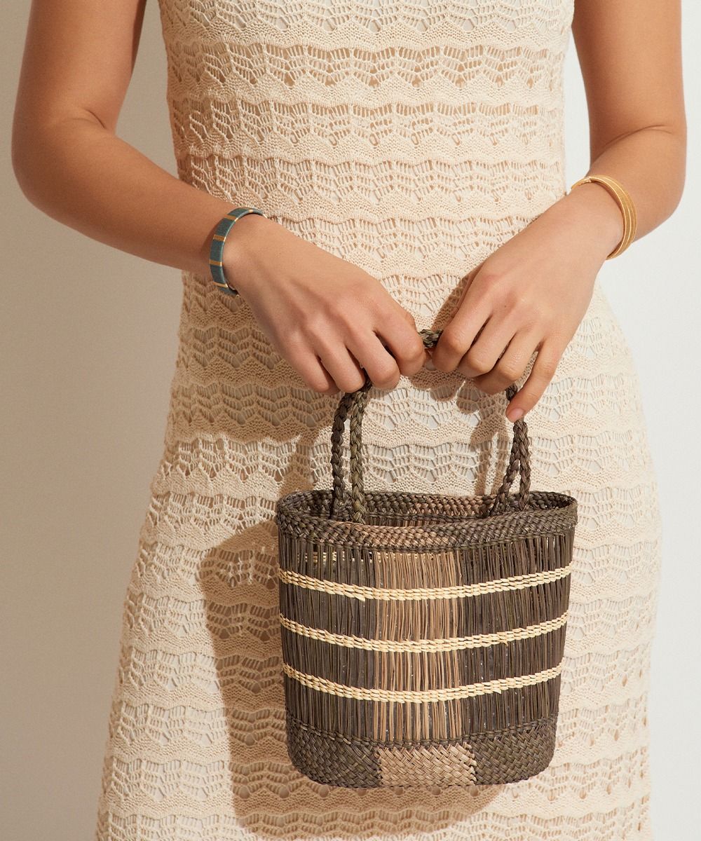 Materials: - 100% Iraca straw - Brass medallion Dimensions: - Height: 18cm - Handle lenght: 12cm - Opening diameter: 18cm