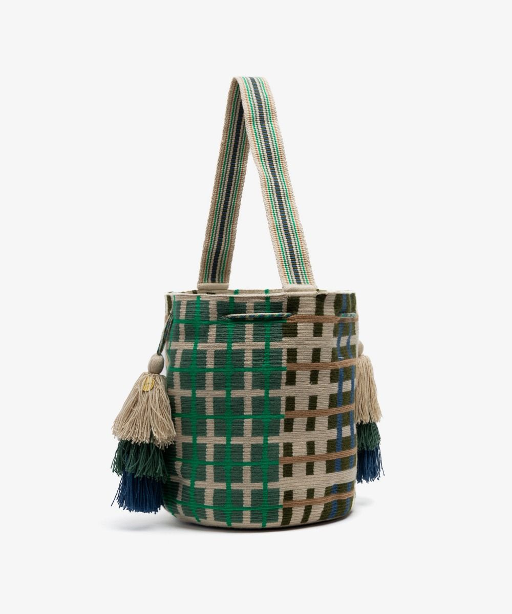 DISEÑADO EN MADRID - 100% HECHO A MANO POR ARTESANAS EN COLOMBIA. GUANÁBANA CREE EN LAS PEQUEÑAS DIFERENCIAS: LOS TAMAÑOS Y DISEÑOS PUEDEN TENER LIGERAS VARIACIONES CON EL MODELO DE LA FOTO. LAVADO A MÁQUINA EN AGUA FRÍA. Material: 100% acrílico Dimensión aproximada: Altura: 24 cm Diámetro: 24 cm Asa: 60 cm