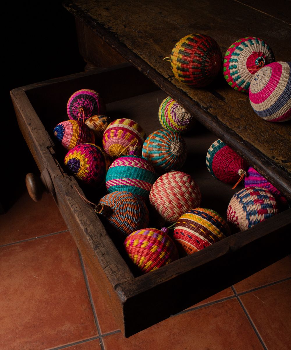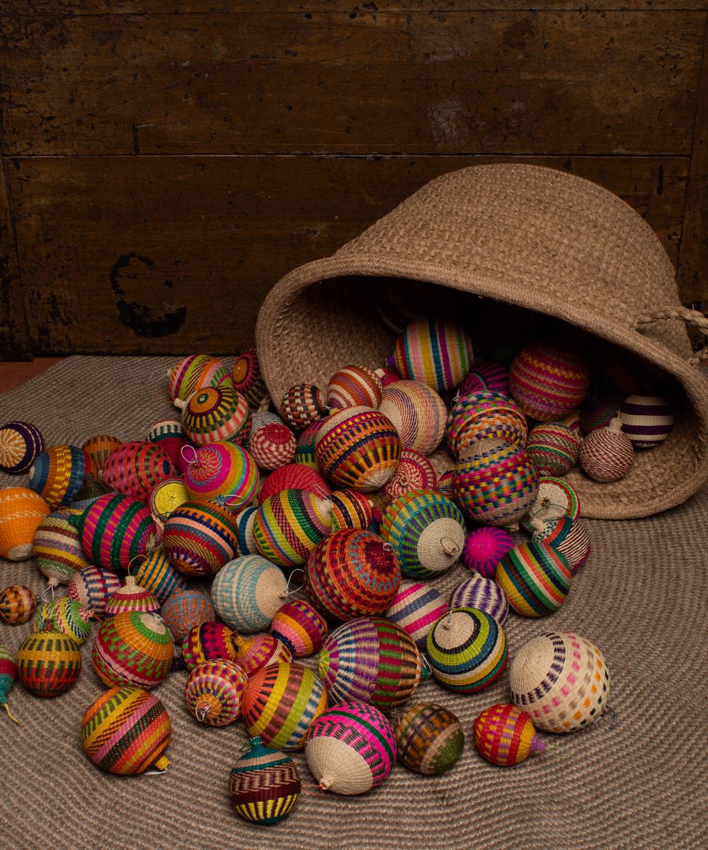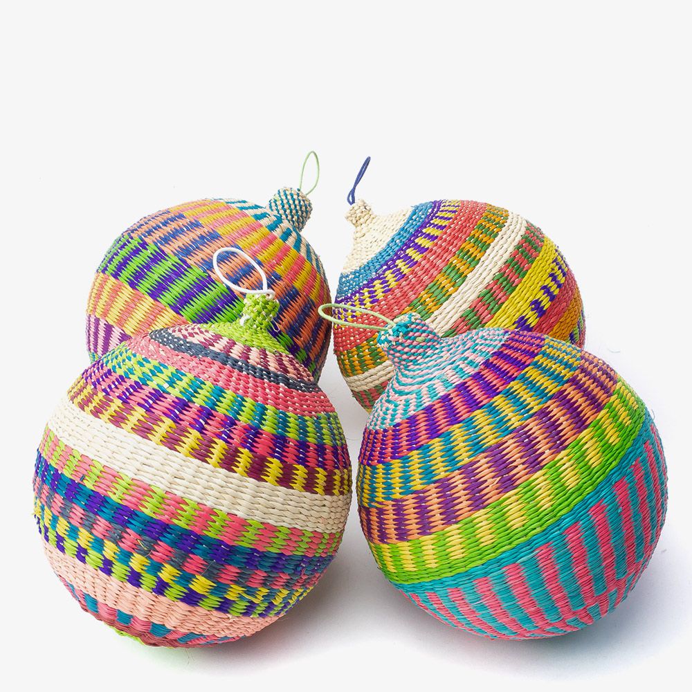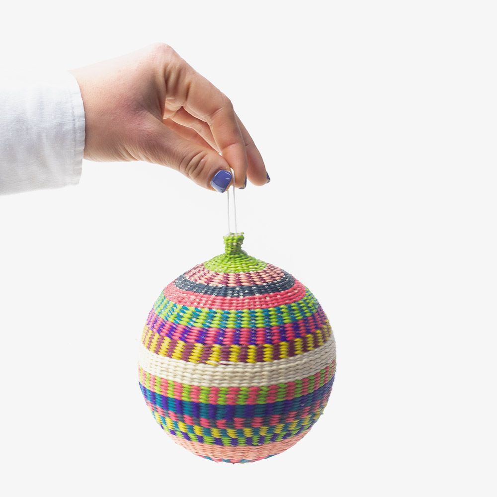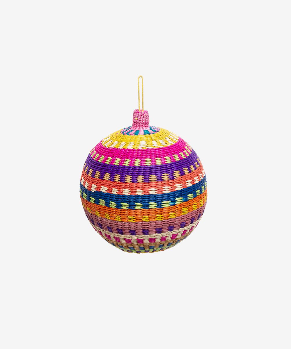 Nuestros ornamentos, bolas de Navidad, están hechas a mano por artesanas utilizando la técnica de tejido en iraca, típica de la tradición colombiana. La iraca, o paja toquilla, es una fibra natural que proviene de la “Carludovica palmata”, de cuyas hojas se obtienen unos finos hilos que son teñidos para darles color. Una vez secos, los artesanos entretejen los hilos con los diferentes colores para crear estas bolas de navidad. Decora tu árbol de Navidad con estas bolas tan coloridas. Si se caen no se rompen, ideales para casa con niños. Para la limpieza se aconseja utilizar un paño húmedo. No es lavable.