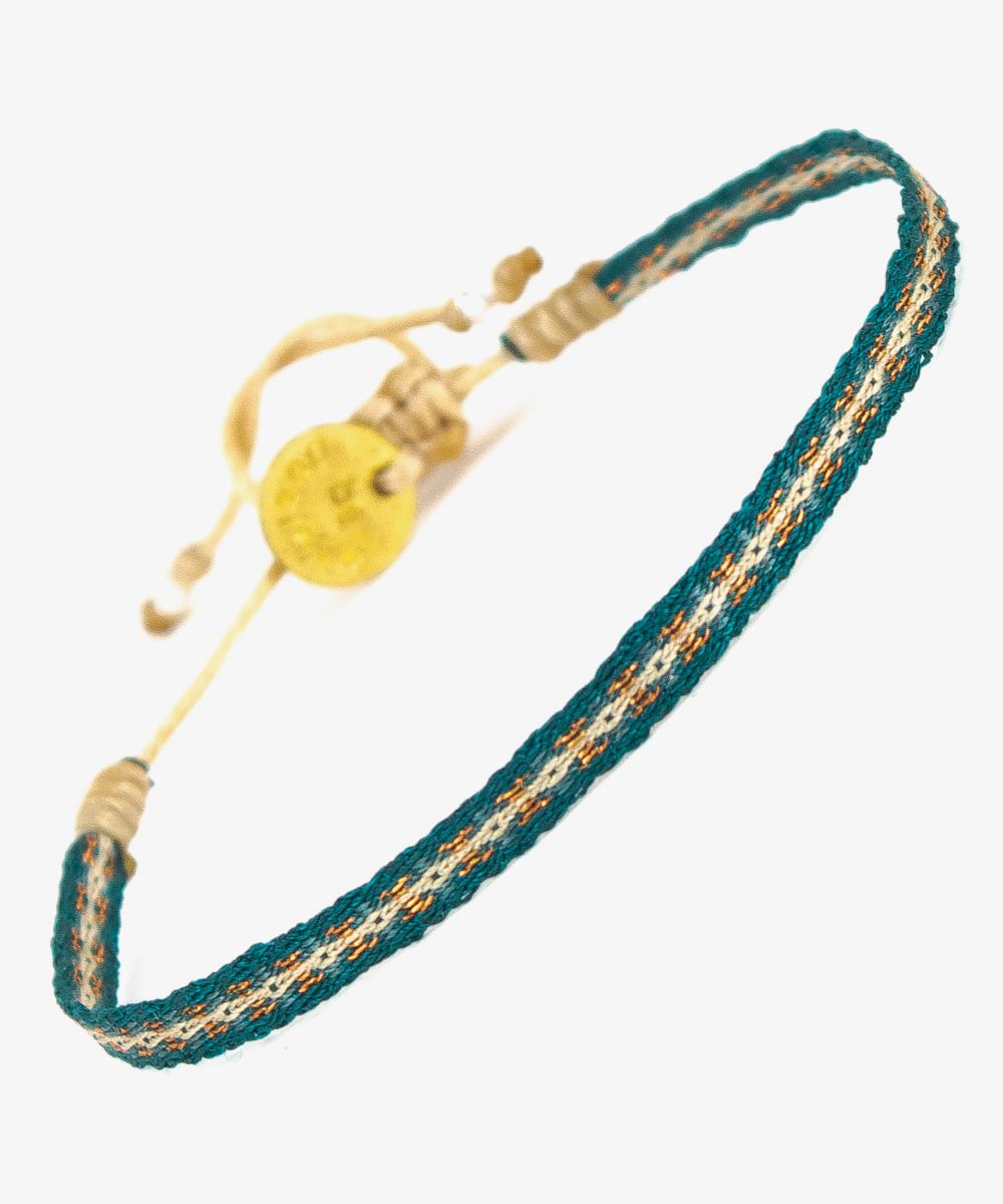 Esta pulsera está diseñada en nuestras oficinas centrales de Madrid. Tejida en un telar manual por artesanos en Colombia, utilizando técnicas antiguas. Cada pulsera está tejida con 40 hilos y cuenta con un cierre para ajustarla a la muñeca. Nuestro consejo: Puedes llevarla sola o mezclándola con varias más!