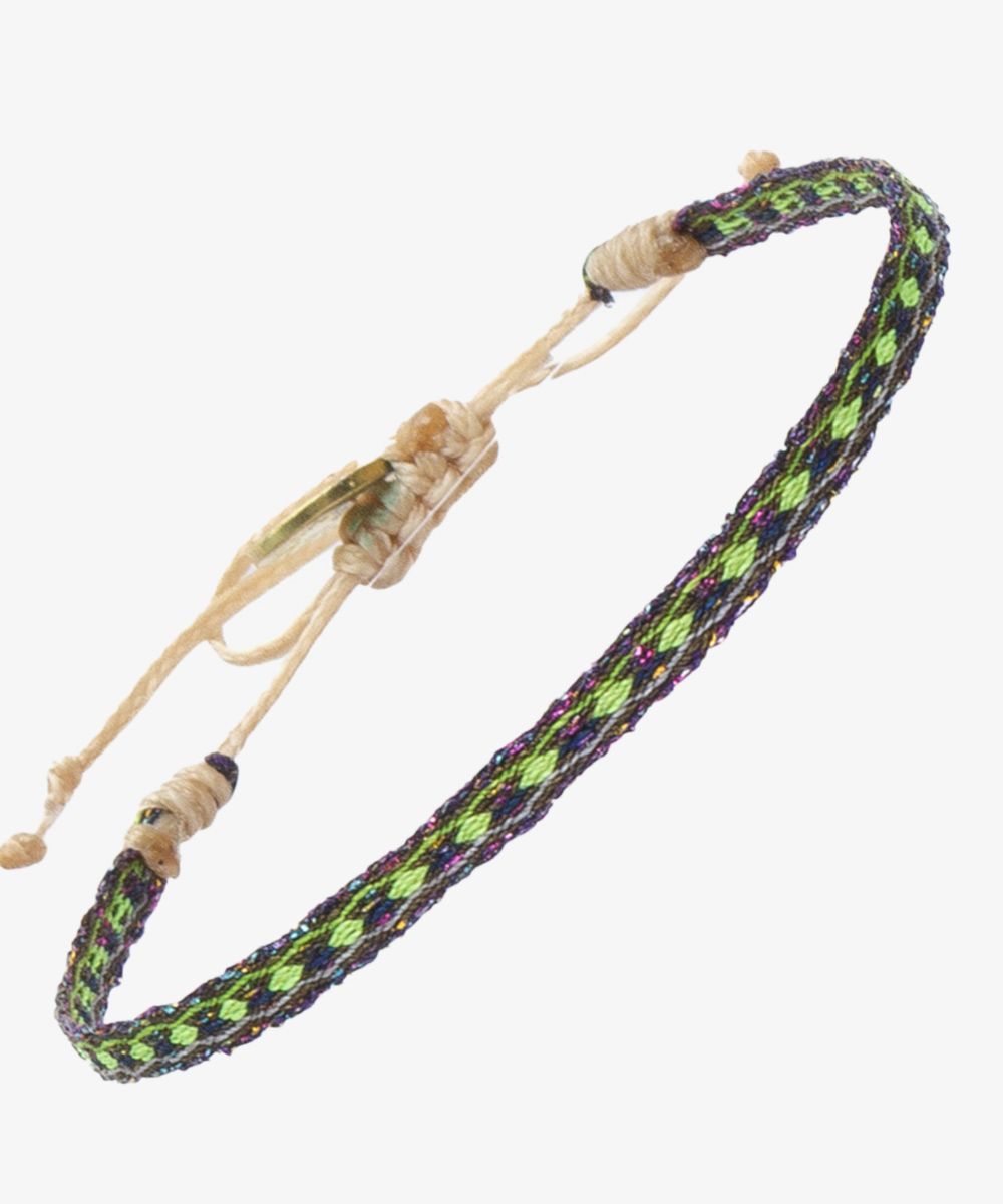 Esta pulsera está diseñada en nuestras oficinas centrales de Madrid. Tejida en un telar manual por artesanos en Colombia, utilizando técnicas antiguas. Cada pulsera está tejida con 40 hilos y cuenta con un cierre para ajustarla a la muñeca. Nuestro consejo: Puedes llevarla sola o mezclándola con varias más! Los detalles de nuestras pulseras hechas a mano, las hacen piezas únicas. Podrás reconocer si es una Pulsera Guanabana por sus diseños especiales y por una pequeña medalla que incluye nuestro logotipo y un mensaje "Be Positive" para que lo repitas como un Mantra.