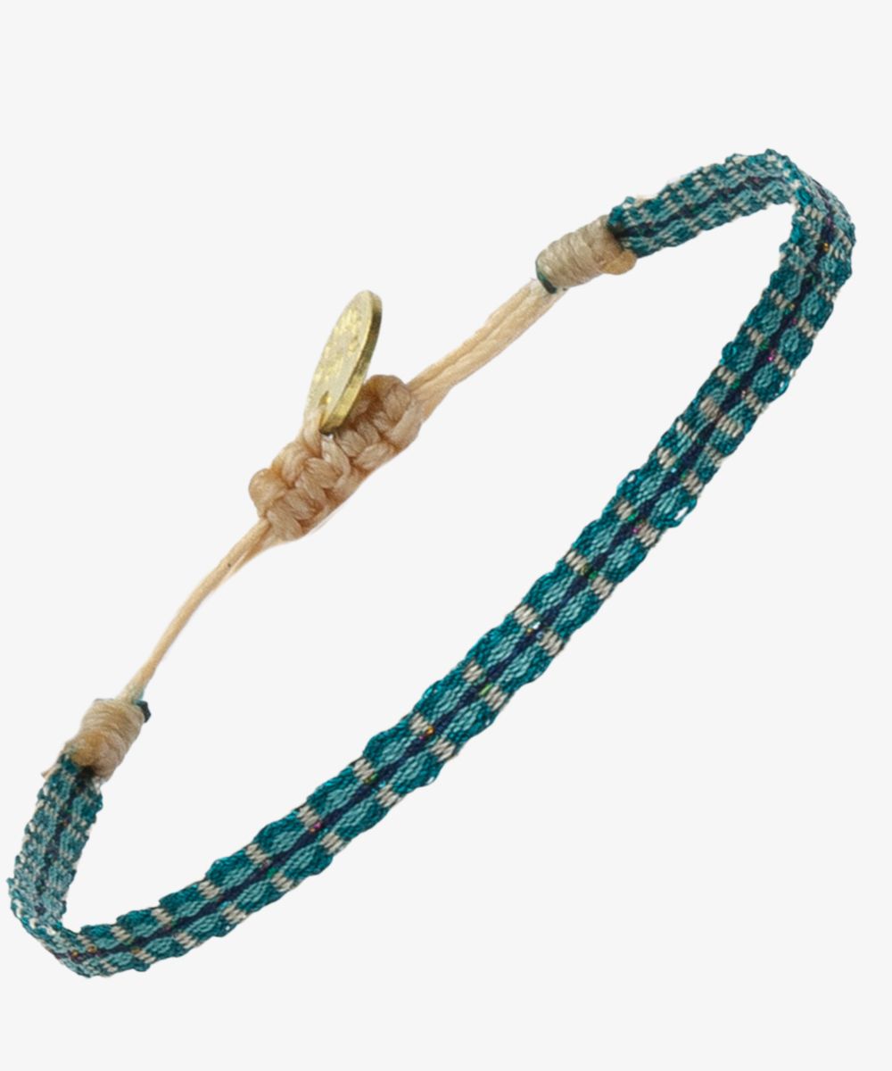 Esta pulsera está diseñada en nuestras oficinas centrales de Madrid. Tejida en un telar manual por artesanos en Colombia, utilizando técnicas antiguas. Cada pulsera está tejida con 40 hilos y cuenta con un cierre para ajustarla a la muñeca. Nuestro consejo: Puedes llevarla sola o mezclándola con varias más!