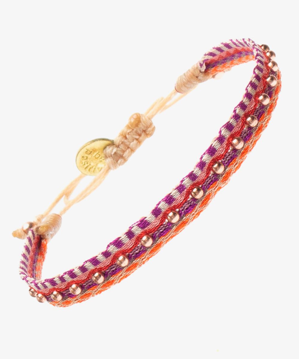 Materials: • 100% acrylic • Rose gold plated beads • Brass medallion Measurements: • Width: 5 mm • Opening (min-max): 15 cm (5.9 inches) - 26 cm (10.23 inches) • Diameter of beads: approx. 2 mm