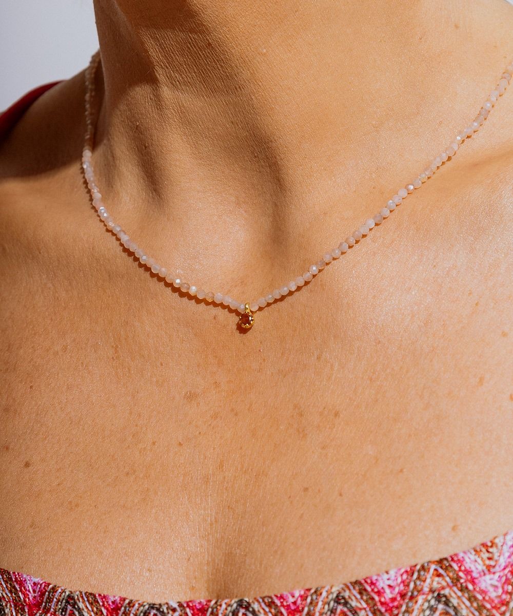 Delicado y femenino, un complemento con un toque étnico que rematará cualquier look, tanto en verano como en invierno. Este diseño exclusivo de Guanábana cuenta con un dije que incluye una piedra semi preciosa, dándole un toque elegante al collar. Nuestro consejo: puedes combinar collares de diferentes largos para crear tu propio conjunto. Nuestro consejo: puedes combinar collares de diferentes largos para crear tu propio conjunto.