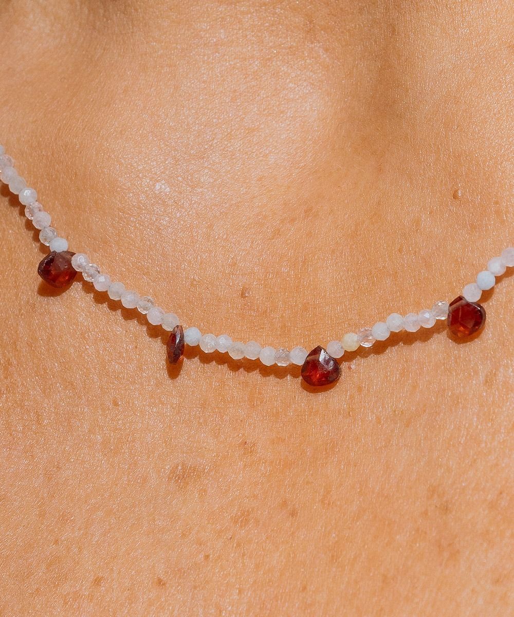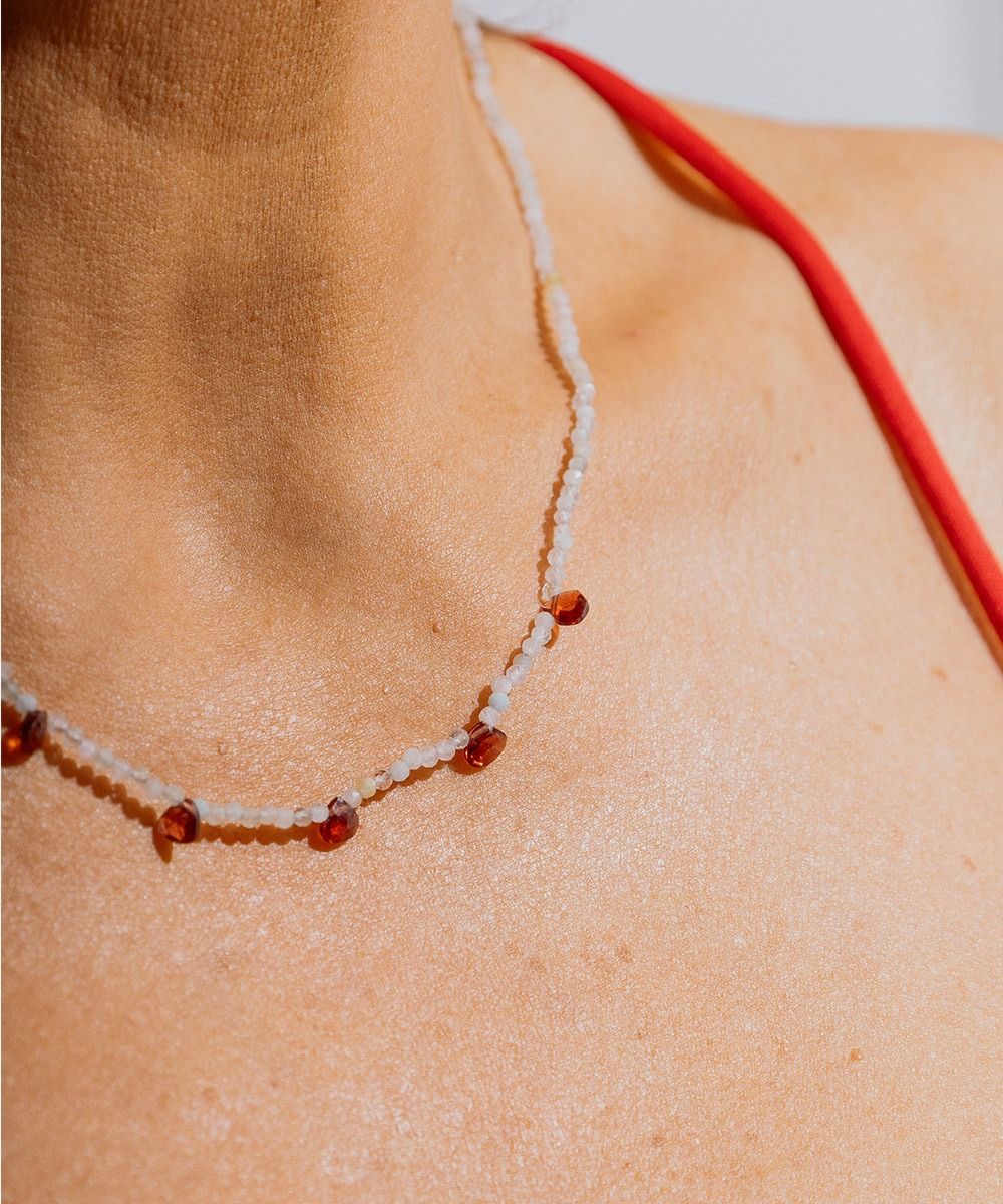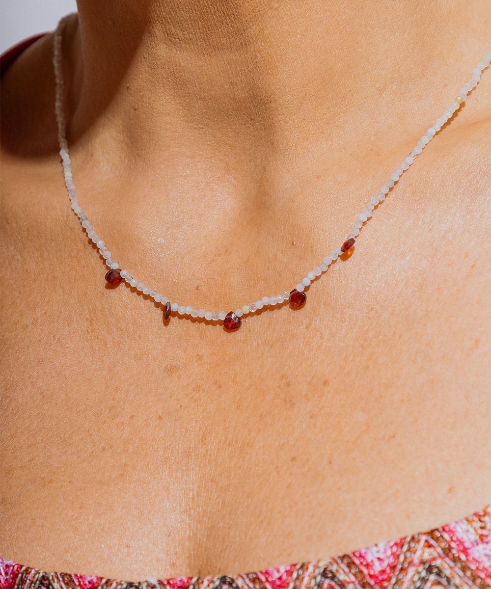 Delicado y femenino, un complemento con un toque étnico que rematará cualquier look, tanto en verano como en invierno. Este diseño exclusivo de Guanábana tiene 5 gotas de piedras semipreciosas, dando un toque moderno y diferente al collar. Nuestro consejo: puedes combinar collares de diferentes largos para crear tu propio atuendo. Nuestro consejo: puedes combinar collares de diferentes largos para crear tu propio atuendo.