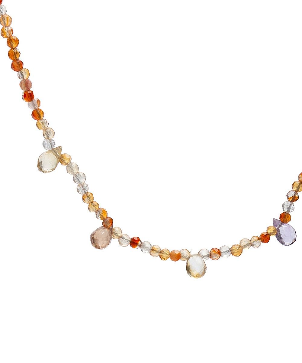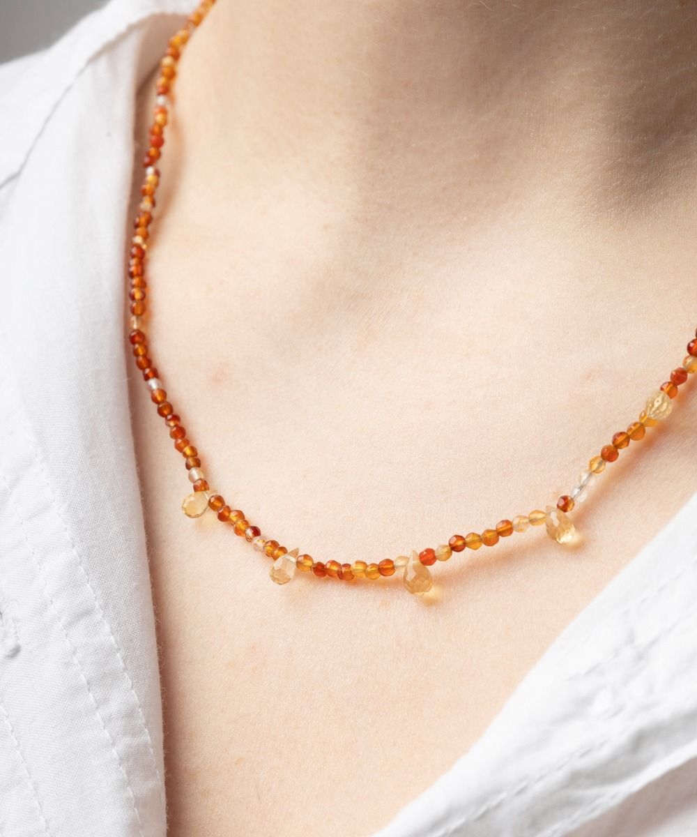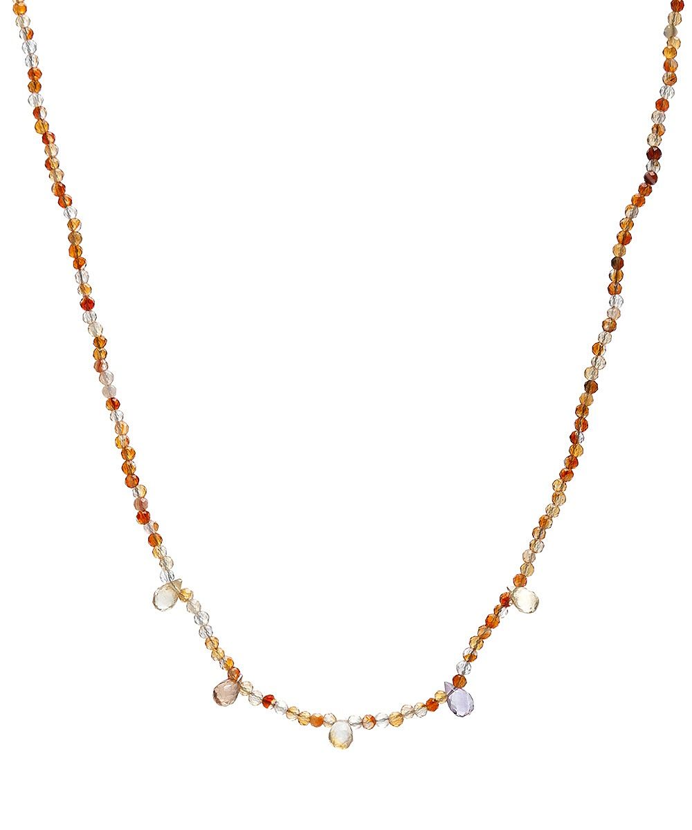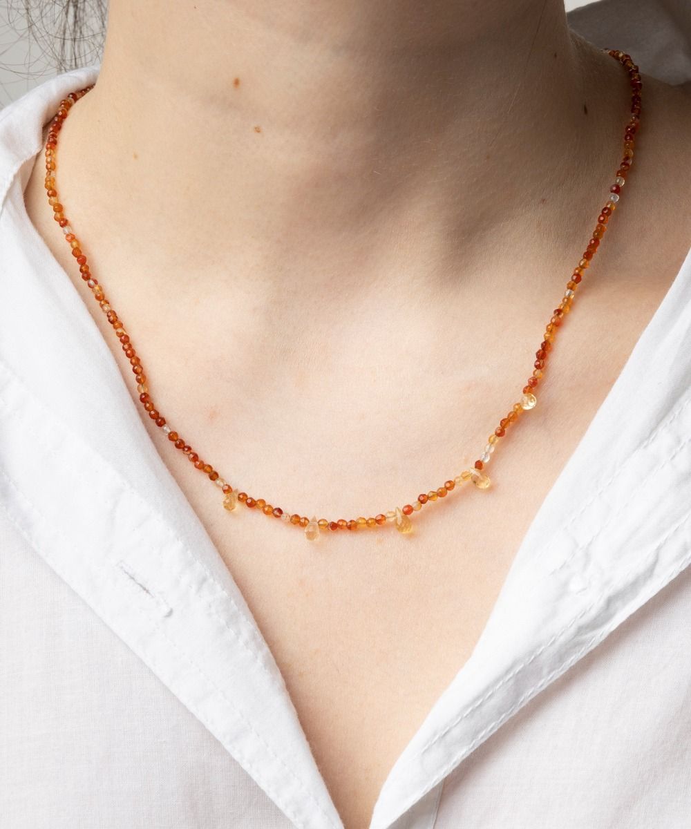 Delicado y femenino, un complemento con un toque étnico que rematará cualquier look, tanto en verano como en invierno. Este diseño exclusivo de Guanábana tiene 5 gotas de piedras semipreciosas, dando un toque moderno y diferente al collar. Nuestro consejo: puedes combinar collares de diferentes largos para crear tu propio atuendo. Nuestro consejo: puedes combinar collares de diferentes largos para crear tu propio atuendo.