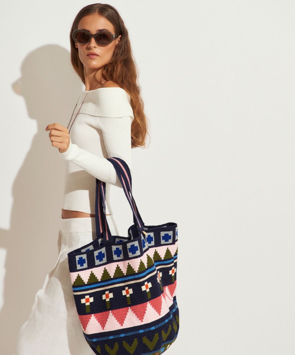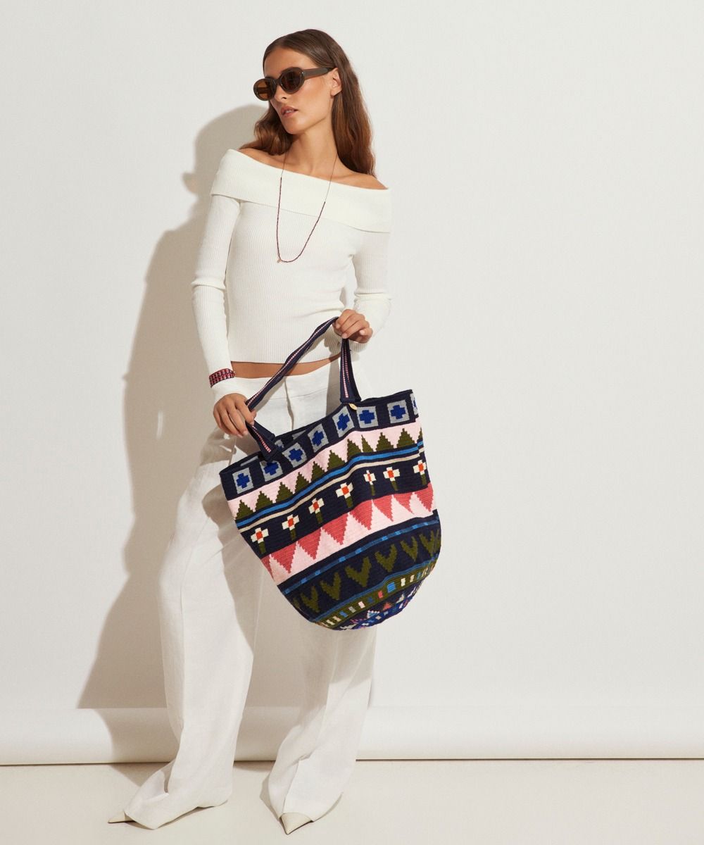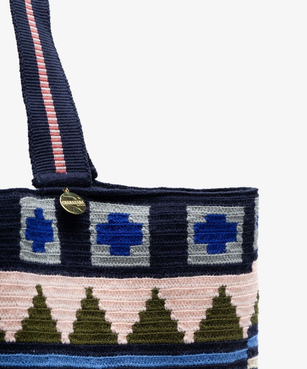 DISEÑADO EN MADRID - 100% HECHO A MANO POR ARTESANAS EN COLOMBIA. GUANÁBANA CREE EN LAS PEQUEÑAS DIFERENCIAS: LOS TAMAÑOS Y DISEÑOS PUEDEN TENER LIGERAS VARIACIONES CON EL MODELO DE LA FOTO. LAVADO A MÁQUINA EN AGUA FRÍA. Material: 100% acrílico Dimensión aproximada: Altura: 38 cm Diámetro: 31 cm Asa: 54 cm