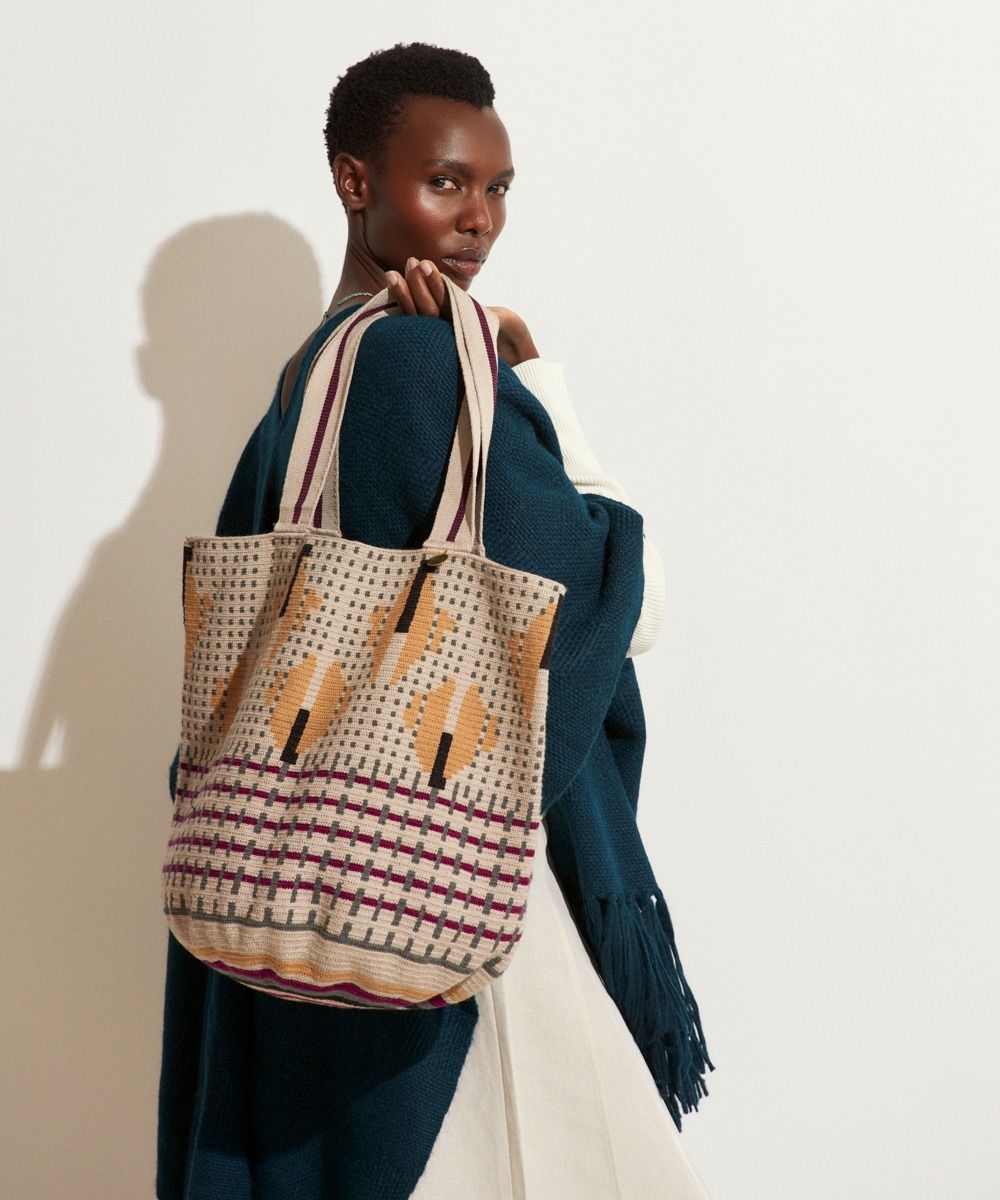 DISEÑADO EN MADRID - 100% HECHO A MANO POR ARTESANAS EN COLOMBIA. GUANÁBANA CREE EN LAS PEQUEÑAS DIFERENCIAS: LOS TAMAÑOS Y DISEÑOS PUEDEN TENER LIGERAS VARIACIONES CON EL MODELO DE LA FOTO. LAVADO A MÁQUINA EN AGUA FRÍA. Material: 100% acrílico Dimensión aproximada: Altura: 38 cm Diámetro: 31 cm Asa: 54 cm