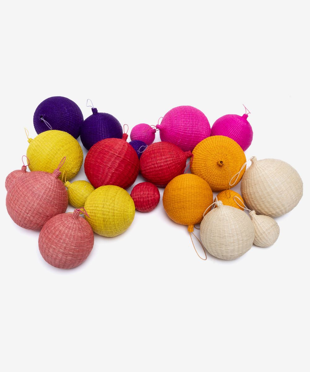 Nuestros ornamentos, bolas de Navidad, están hechas a mano por artesanas utilizando la técnica de tejido en iraca, típica de la tradición colombiana. La iraca, o paja toquilla, es una fibra natural que proviene de la “Carludovica palmata”, de cuyas hojas se obtienen unos finos hilos que son teñidos para darles color. Una vez secos, los artesanos entretejen los hilos con los diferentes colores para crear estas bolas de navidad. Decora tu árbol de Navidad con estas bolas tan coloridas. Si se caen no se rompen, ideales para casa con niños. Para la limpieza se aconseja utilizar un paño húmedo. No es lavable.