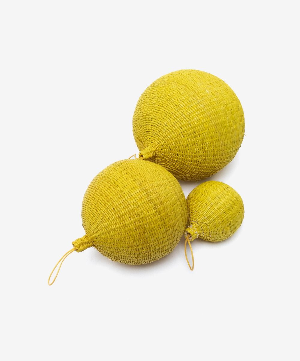 Nuestros ornamentos, bolas de Navidad, están hechas a mano por artesanas utilizando la técnica de tejido en iraca, típica de la tradición colombiana. La iraca, o paja toquilla, es una fibra natural que proviene de la “Carludovica palmata”, de cuyas hojas se obtienen unos finos hilos que son teñidos para darles color. Una vez secos, los artesanos entretejen los hilos con los diferentes colores para crear estas bolas de navidad.