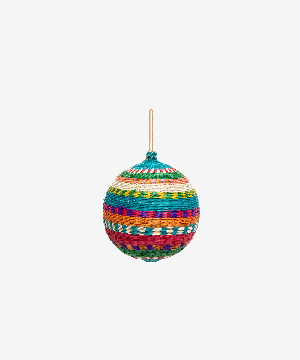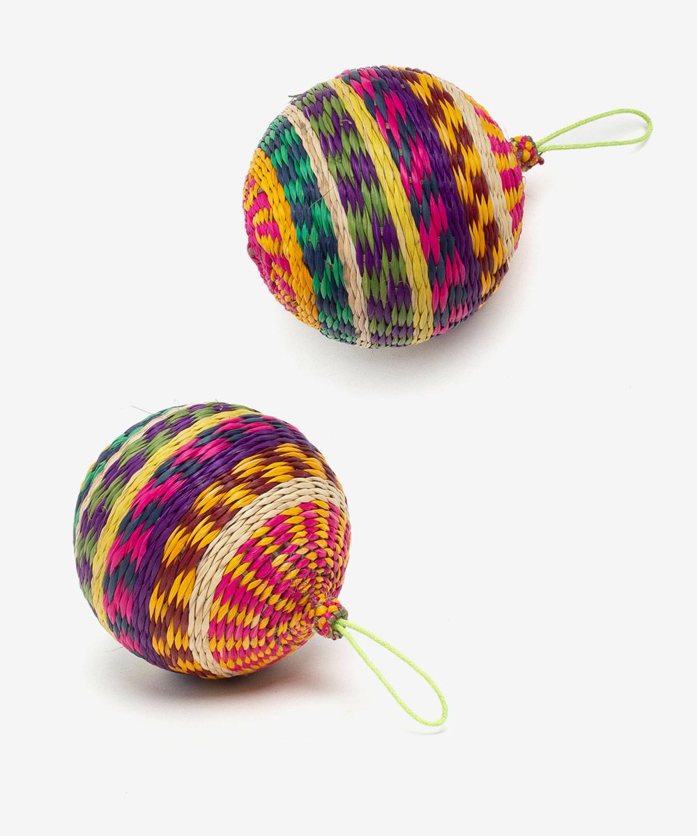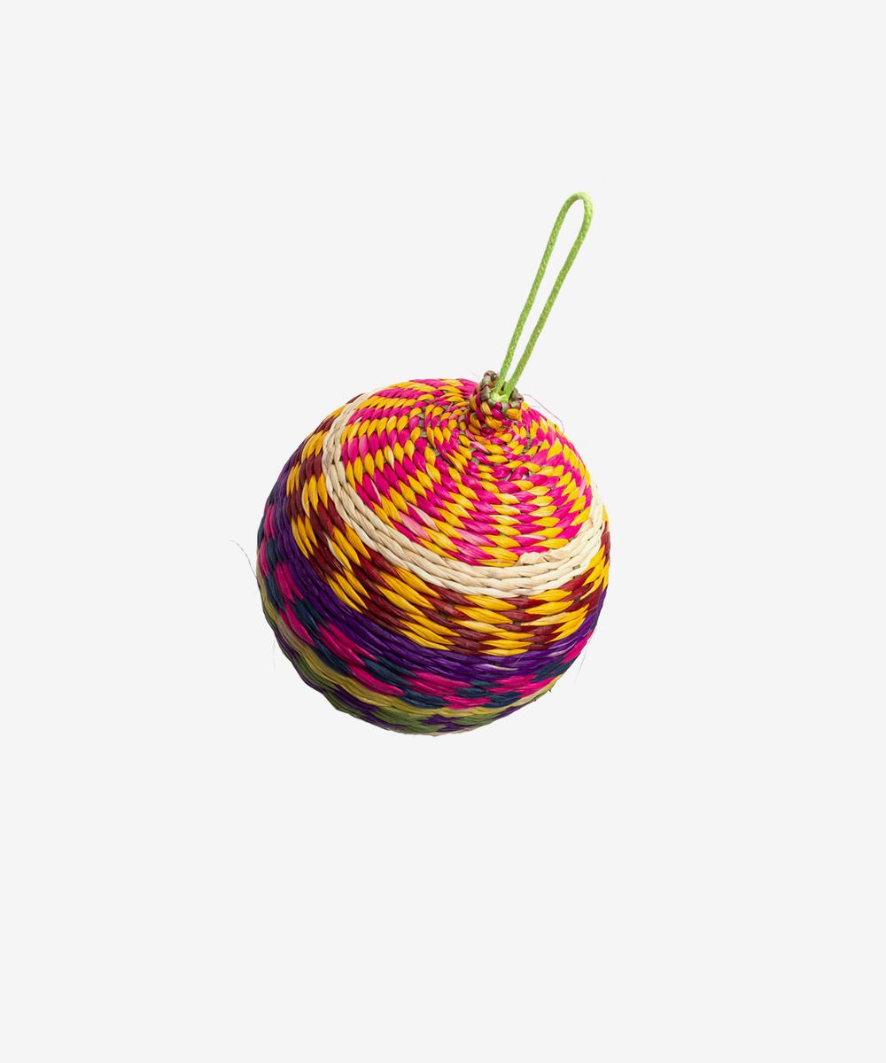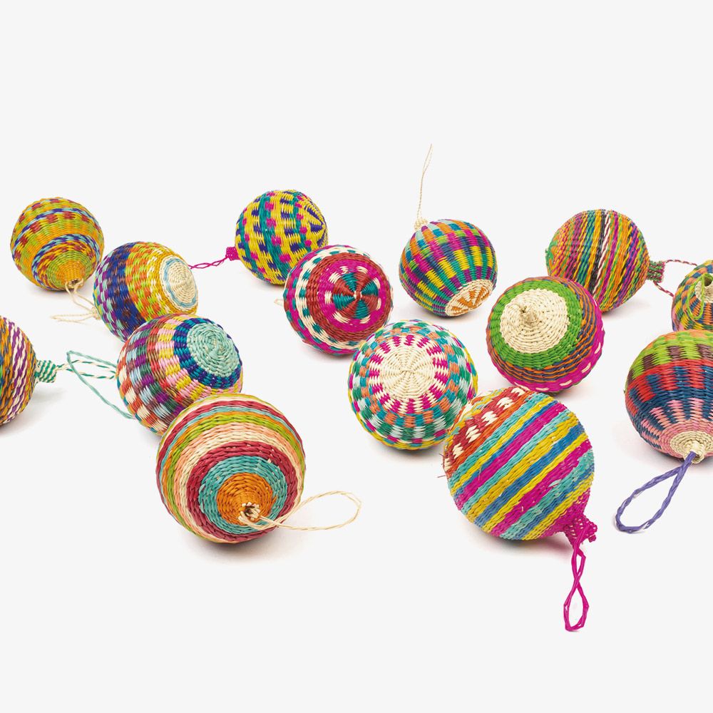 Nuestros ornamentos, bolas de Navidad, están hechas a mano por artesanas utilizando la técnica de tejido en iraca, típica de la tradición colombiana. La iraca, o paja toquilla, es una fibra natural que proviene de la “Carludovica palmata”, de cuyas hojas se obtienen unos finos hilos que son teñidos para darles color. Una vez secos, los artesanos entretejen los hilos con los diferentes colores para crear estas bolas de navidad.