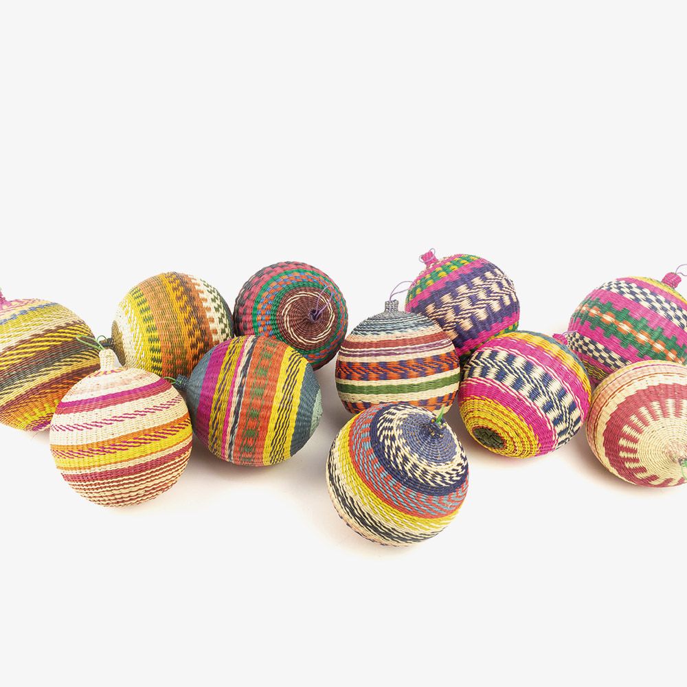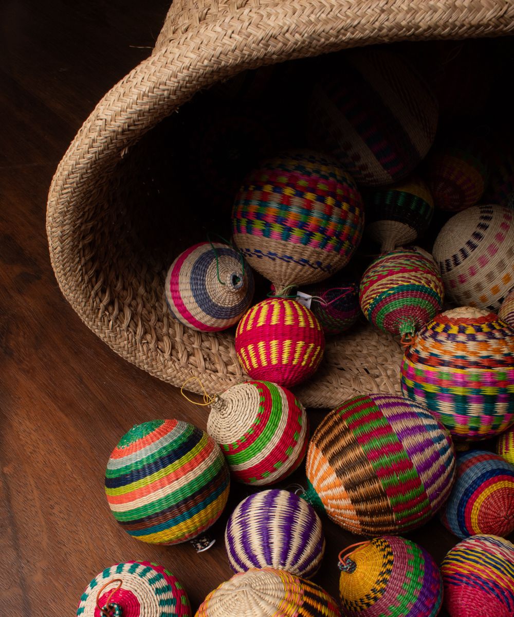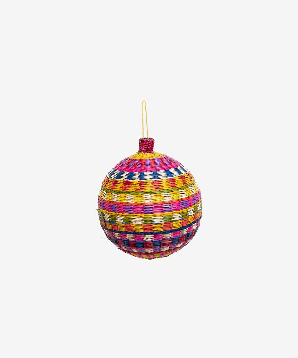 Nuestros ornamentos, bolas de Navidad, están hechas a mano por artesanas utilizando la técnica de tejido en iraca, típica de la tradición colombiana. La iraca, o paja toquilla, es una fibra natural que proviene de la “Carludovica palmata”, de cuyas hojas se obtienen unos finos hilos que son teñidos para darles color. Una vez secos, los artesanos entretejen los hilos con los diferentes colores para crear estas bolas de navidad. Decora tu árbol de Navidad con estas bolas tan coloridas. Si se caen no se rompen, ideales para casa con niños. Para la limpieza se aconseja utilizar un paño húmedo. No es lavable.