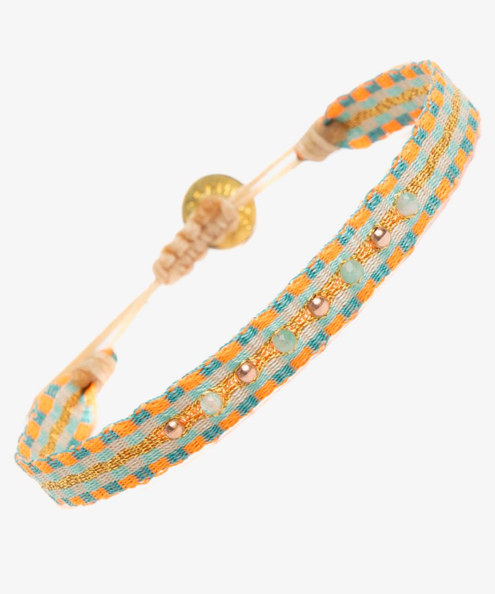 Guanábana da un giro a su tradicional ARGANTINA y la convierte en un accesorio brillante y colorido, con cuentas de piedras semipreciosas que aportan sofisticación a la pulsera. La argantina ALAMEIN está tejida a mano por artesanas usando un telar manual y acabada con un cierre ajustable y una medallita en bronce con nuestro mantra para que no lo olvides: BE POSITIVE.