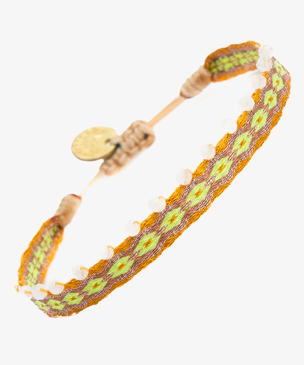 Guanábana da un giro a su tradicional ARGANTINA y la convierte en un accesorio brillante y colorido, con cuentas de piedras semipreciosas que aportan sofisticación a la pulsera. La argantina ALAMEIN está tejida a mano por artesanas usando un telar manual y acabada con un cierre ajustable y una medallita en bronce con nuestro mantra para que no lo olvides: BE POSITIVE.