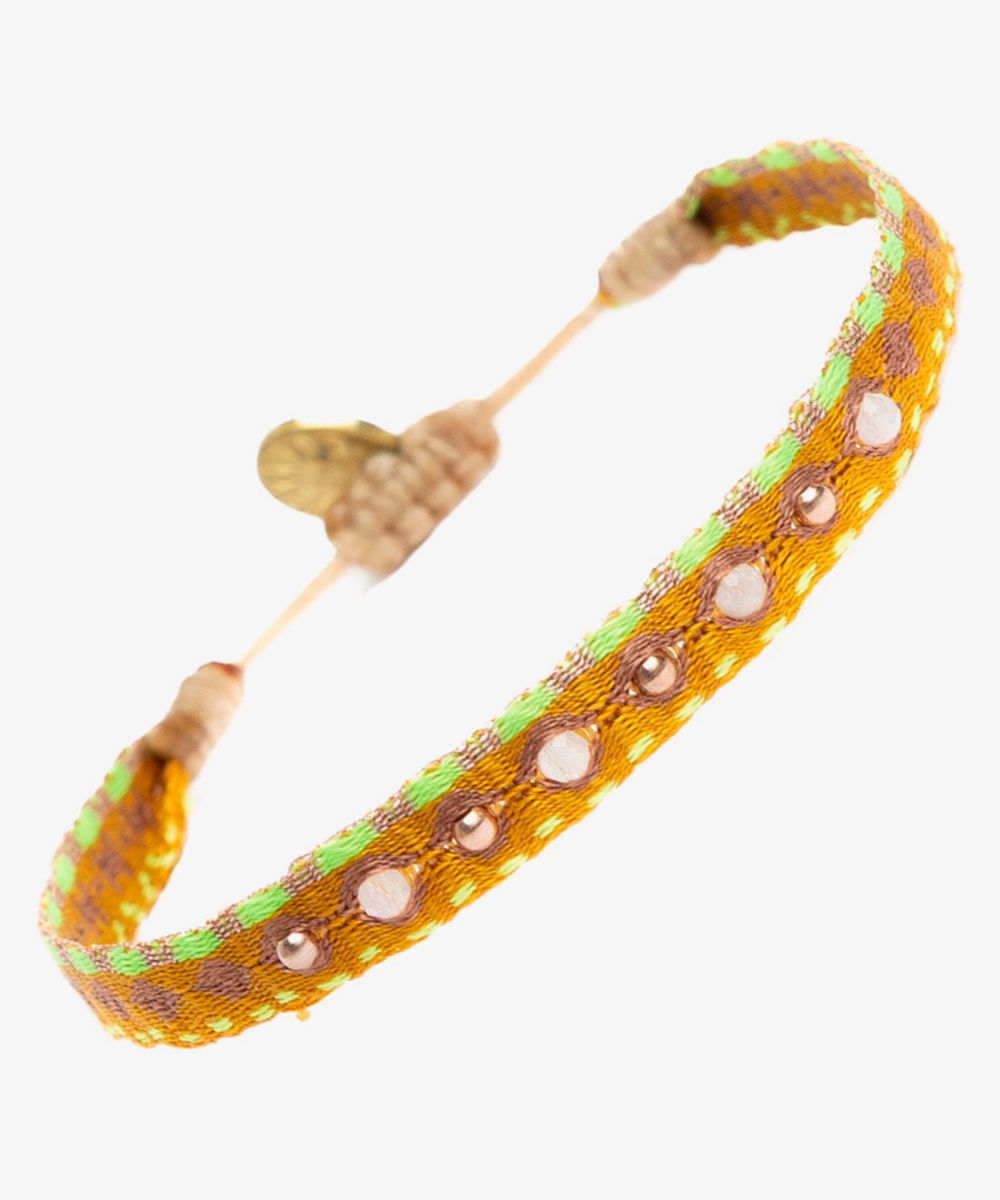 Guanábana da un giro a su tradicional ARGANTINA y la convierte en un accesorio brillante y colorido, con cuentas de piedras semipreciosas que aportan sofisticación a la pulsera. La argantina ALAMEIN está tejida a mano por artesanas usando un telar manual y acabada con un cierre ajustable y una medallita en bronce con nuestro mantra para que no lo olvides: BE POSITIVE.