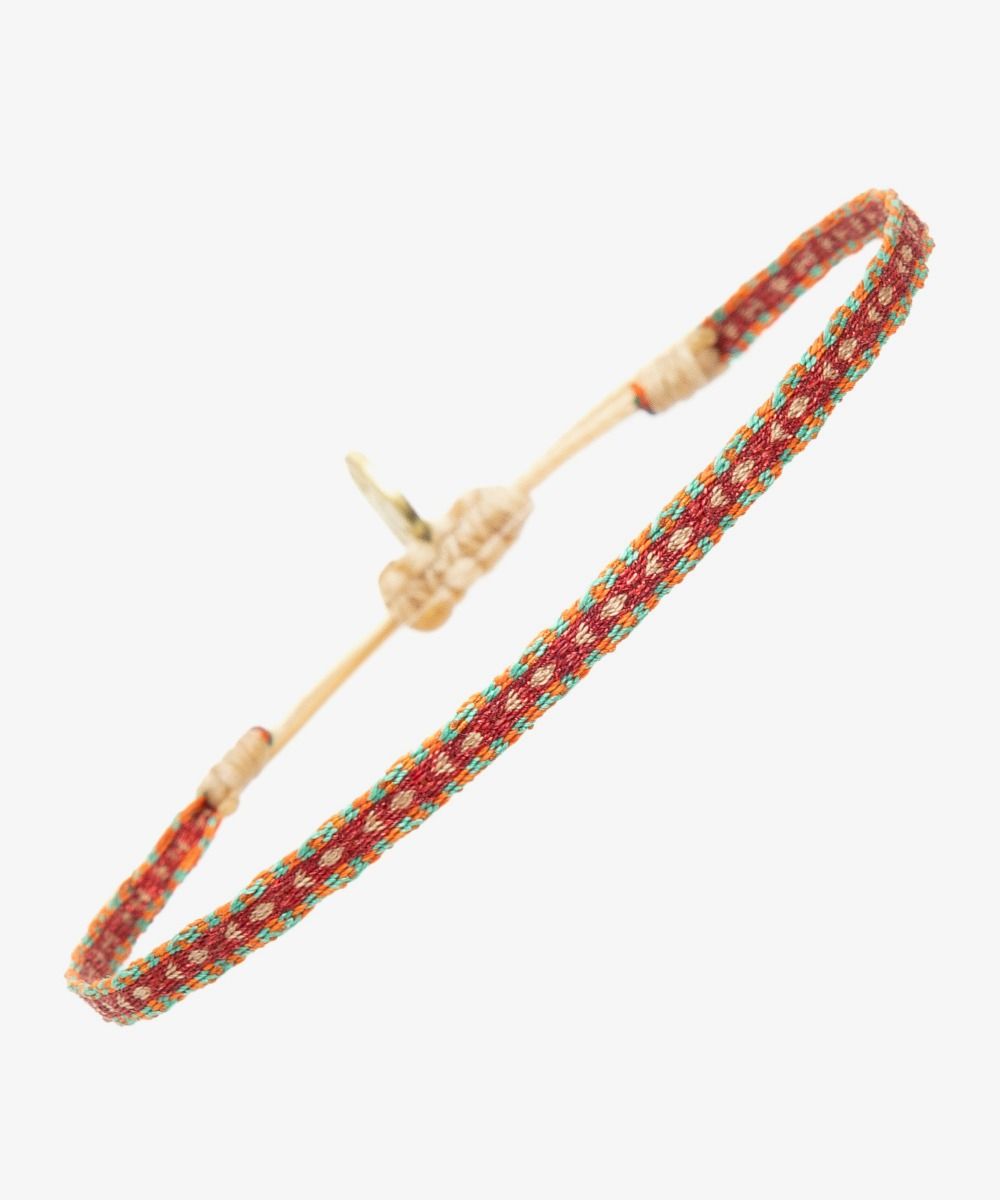 Esta pulsera está diseñada en nuestras oficinas centrales de Madrid. Tejida en un telar manual por artesanos en Colombia, utilizando técnicas antiguas. Cada pulsera está tejida con 40 hilos y cuenta con un cierre para ajustarla a la muñeca. Nuestro consejo: Puedes llevarla sola o mezclándola con varias más!