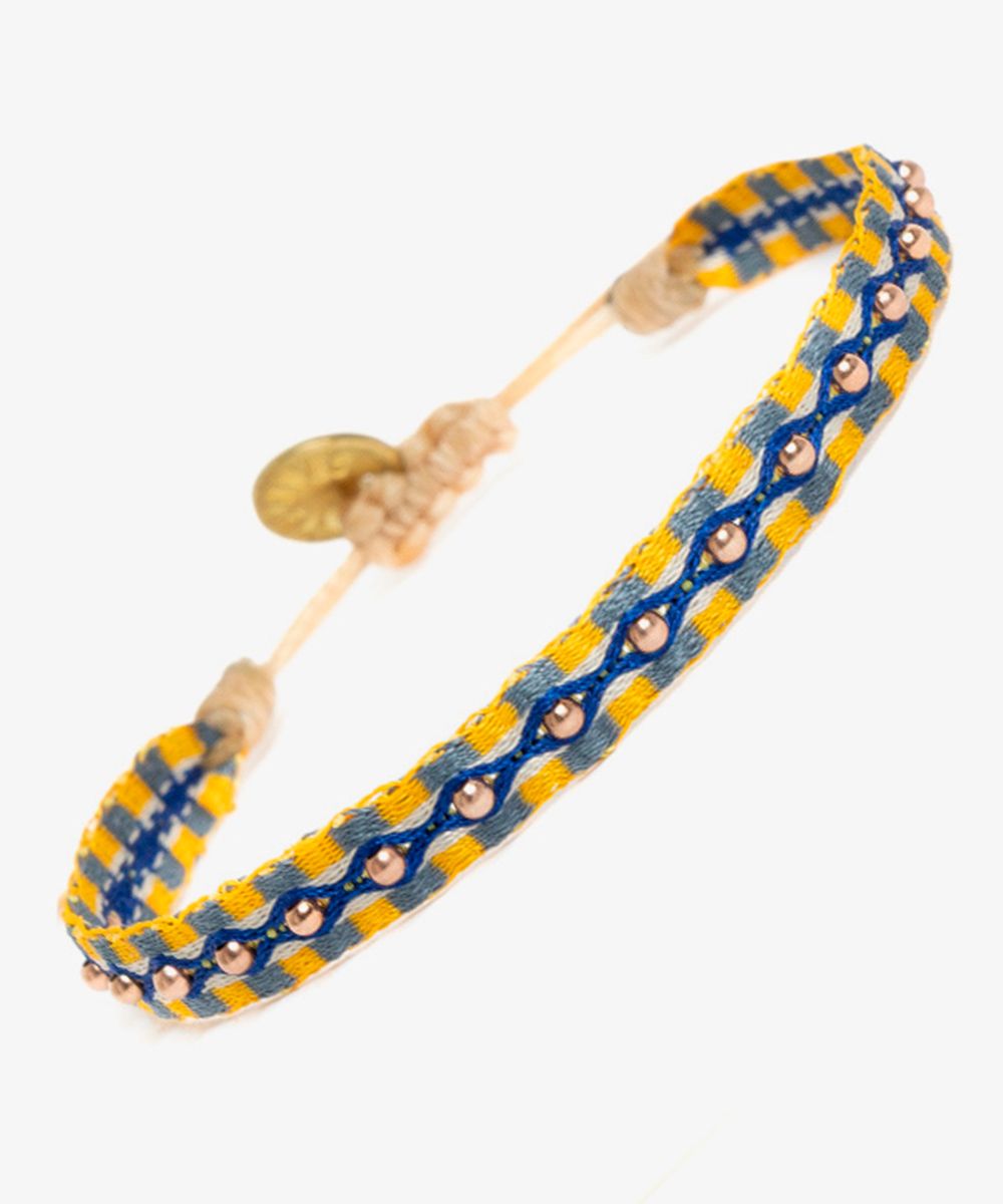 Materials: • 100% acrylic • Rose gold plated beads • Brass medallion Measurements: • Width: 5 mm • Opening (min-max): 15 cm (5.9 inches) - 26 cm (10.23 inches) • Diameter of beads: approx. 2 mm