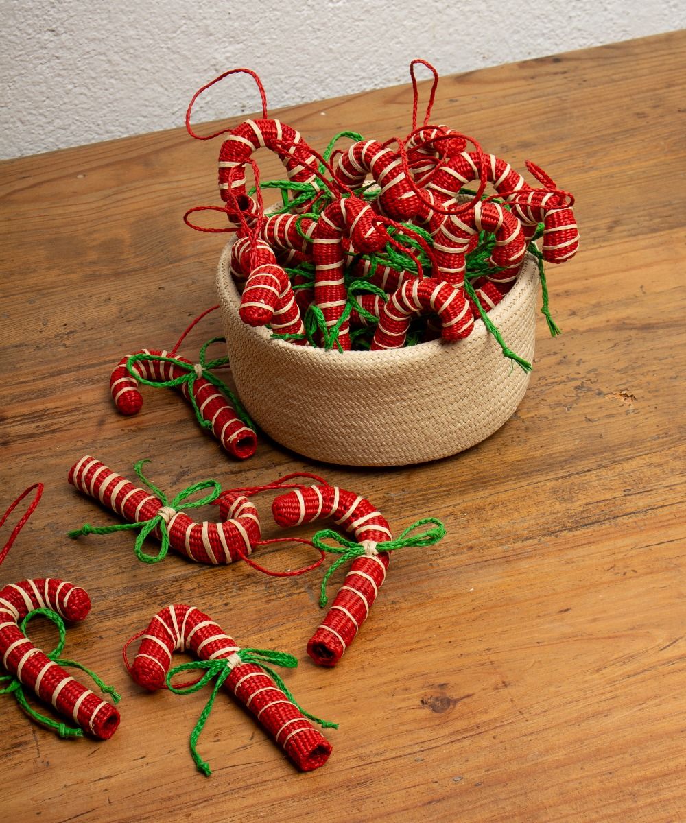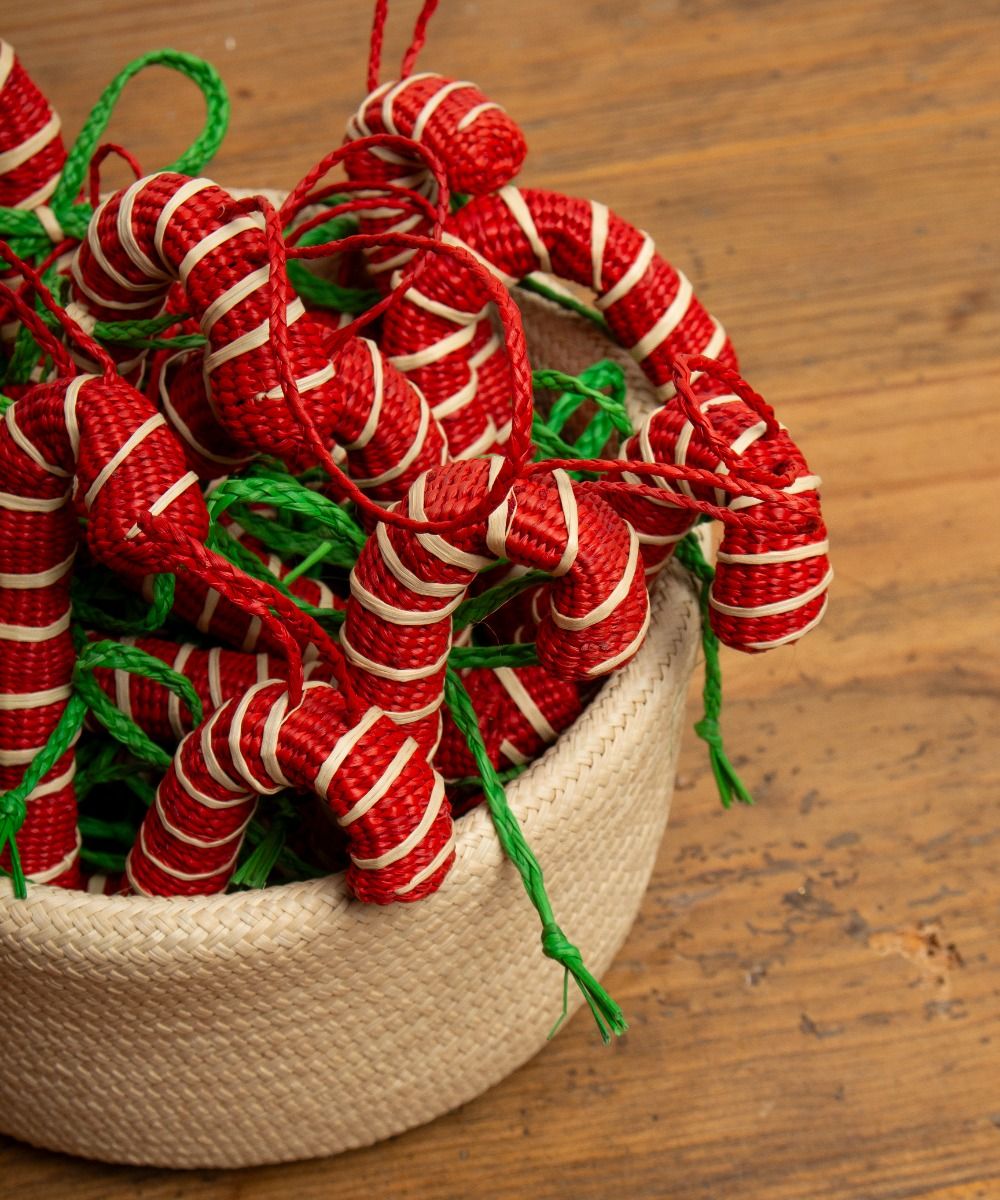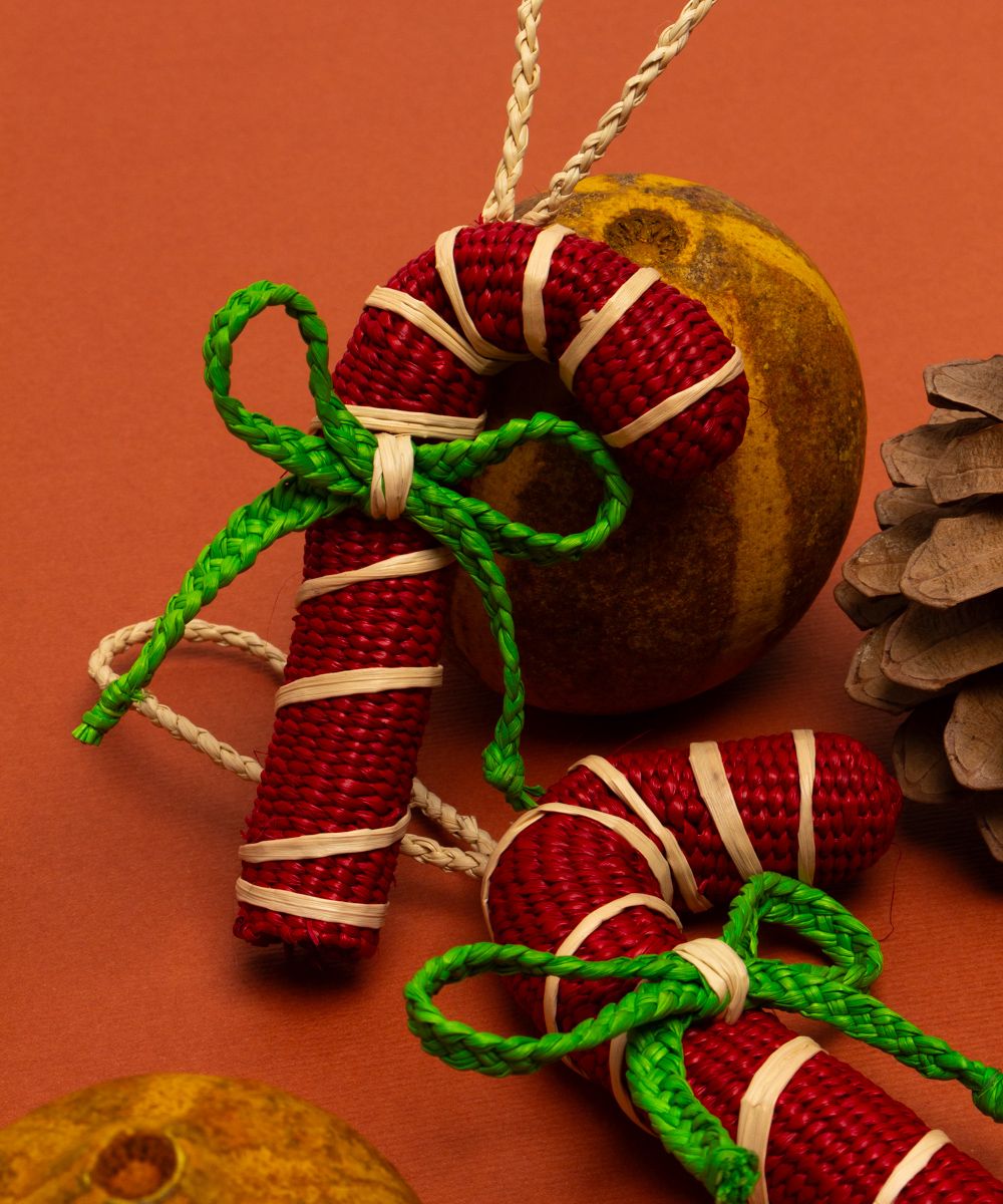 Nuestros adornos están hechos a mano por artesanas utilizando la técnica de tejido en iraca, típica de la tradición colombiana. La iraca, o paja toquilla, es una fibra natural que proviene de la “Carludovica palmata”, de cuyas hojas se obtienen unos finos hilos que son teñidos para darles color. Una vez secos, los artesanos entretejen los hilos con los diferentes colores para crear estos adornos de navidad.