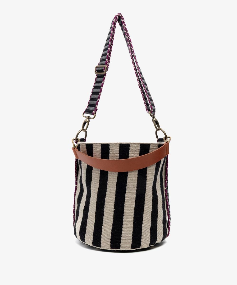 Diseñado en Madrid 100% hecho a mano por mujeres en Colombia. Guanábana abraza pequeñas diferencias: los tamaños o diseños pueden variar respecto a la imagen. Lavado: a máquina en agua fría, sin las asas. Material: 80% acrílico, 15% cuero y 5% metal Dimensiones aproximadas: Altura: 27 cm (10,6 pulgadas) Diámetro: 27 cm (10,6 pulgadas) Asa ajustable: 65 cm hasta 110 cm (25,6 – 43,3 pulgadas) Asa de cuero 100% vacuno: 40 cm de largo (15,7 pulgadas), 3,5 mm de ancho (0,14 pulgadas)
