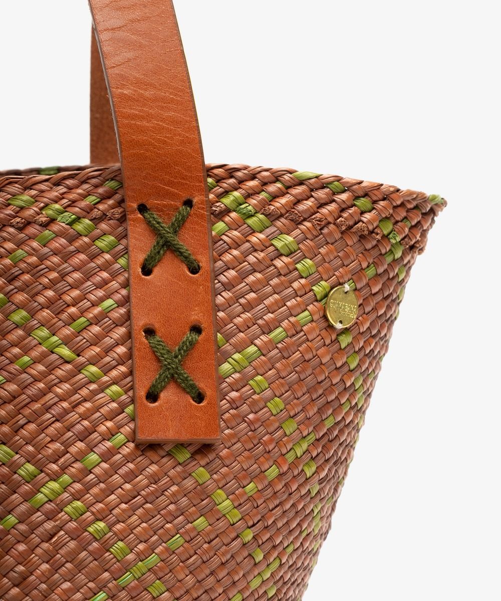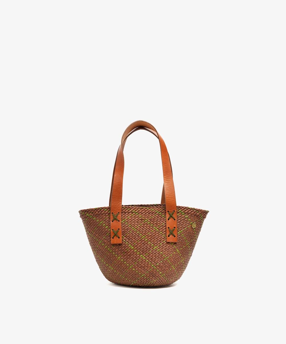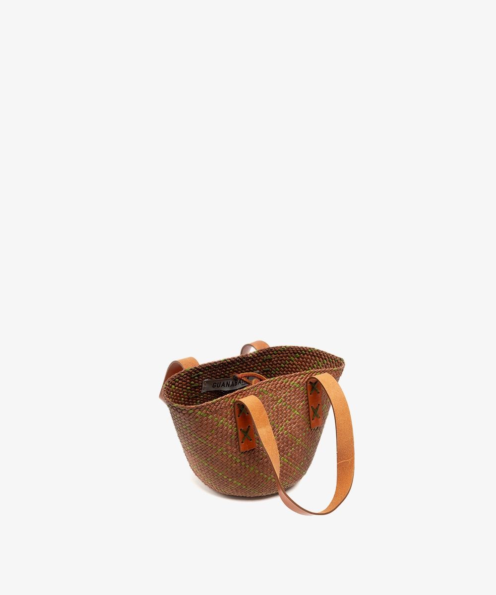 - 100% paja de iraca - Medallón de latón Dimensiones: - Altura: 14 cm - Longitud de las asas: 15 cm (5,9 pulgadas) - Diámetro de la abertura: 17 cm Cada bolso es único y está hecho a mano, por lo que puede haber ligeras variaciones de forma o tamaño. No se puede lavar a máquina; lavar con un paño húmedo.